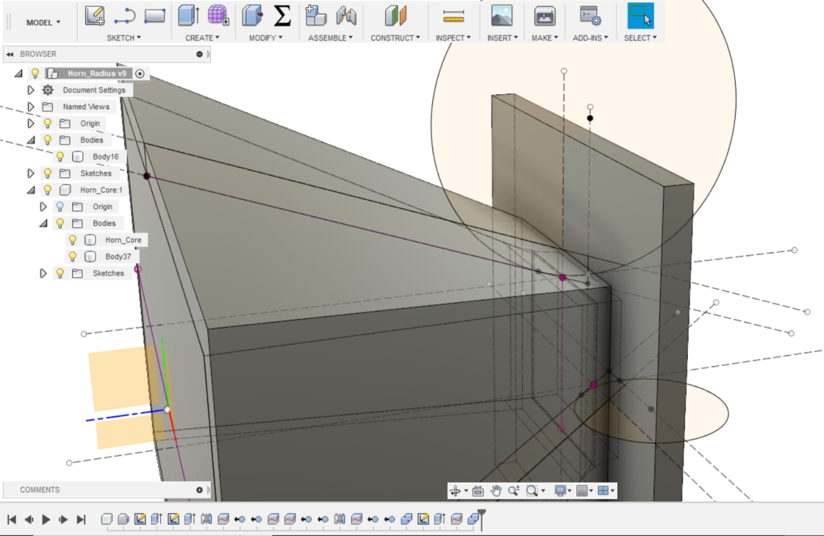 Returning to Fusion 360, I exported the midhorn core to a new design, and created a model just for the arcs.