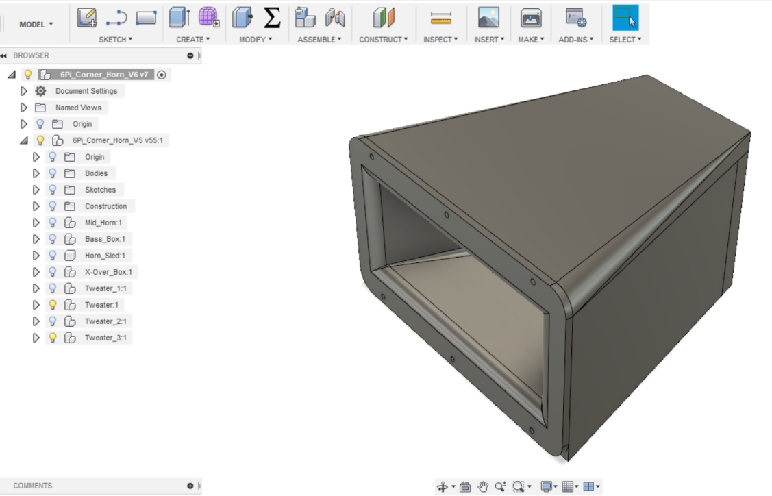 I spent some time trying to figure where to put the crossovers. I know it is common to put them in a box, and set them on the floor next to the speakers. I am not the neatest person in the world, and this sort of thing just creates more mess in my world. I did want ready access to them, so putting them inside the bass bin seemed a bad option. After experimenting in CAD for a while, I settled on putting them in boxes, and mounting the boxes on the back of the midhorn. The pros of this are the crossovers are easily accessible, the box can be used to brace the back panel eliminating the need for a rubber ball behind the driver, and the crossovers are near the drivers making for a clean set up. The cons are that if I need to unplug the midhorn for testing, I will have to remove the box, and the fasteners are pretty expensive.