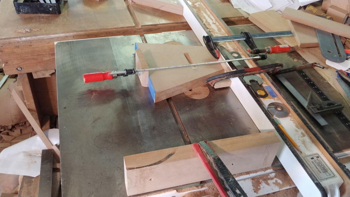 I had saved all the offcuts from the horn to be used as internal bracing. I fitted one brace by trial and error using the bandsaw and a sanding block. Once the brace is close to being a good fit to the taper, one can hold the brace in place against one side, and scribe a line with a pencil laid flat on the other side. Then it is just a simple matter of trimming the edge parallel to the pencil line until it fits properly.