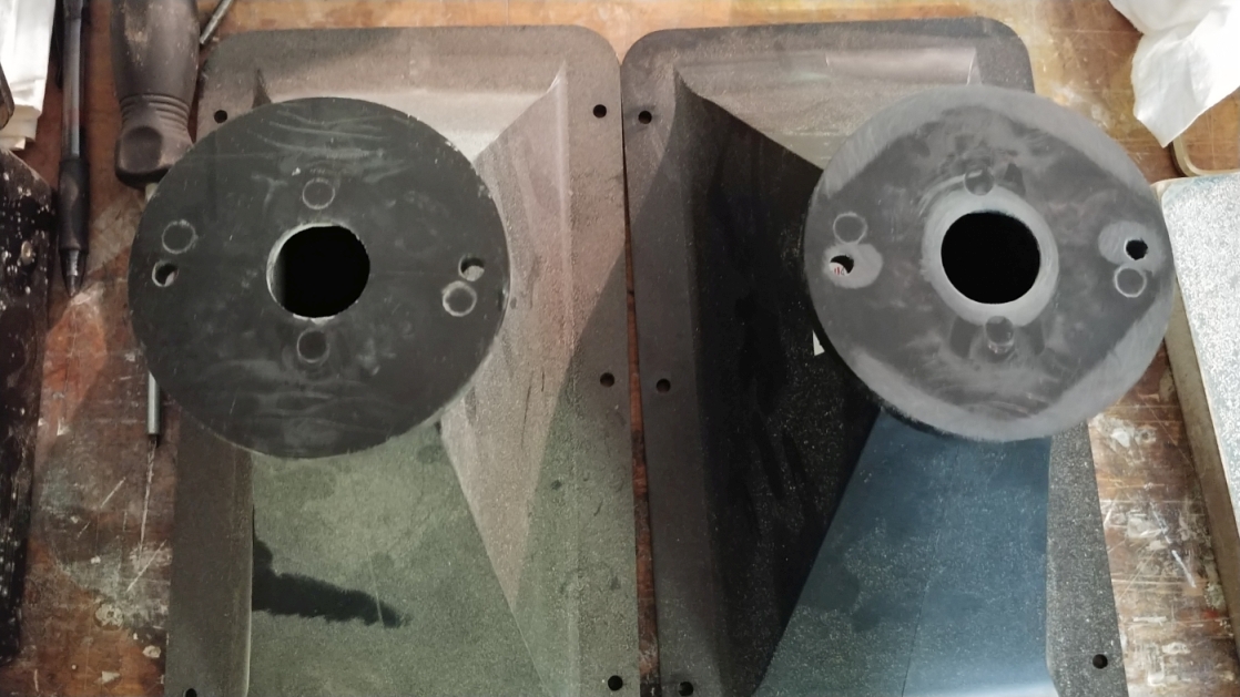 I then marked out and drilled the 4 holes for mounting the box through both parts. The holes in the horn back gets drilled over sized later to take the 1/4" threaded inserts. After separating the parts, I drill the holes for the binding posts.