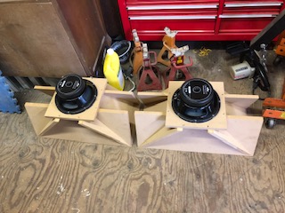 When they are completed, I will (temporarily) sit them on bass cabinets that are the same shape (like a wedge) that I had built/used in our living room, until I get the time to build the proper, bottom (7pi) bass bin.