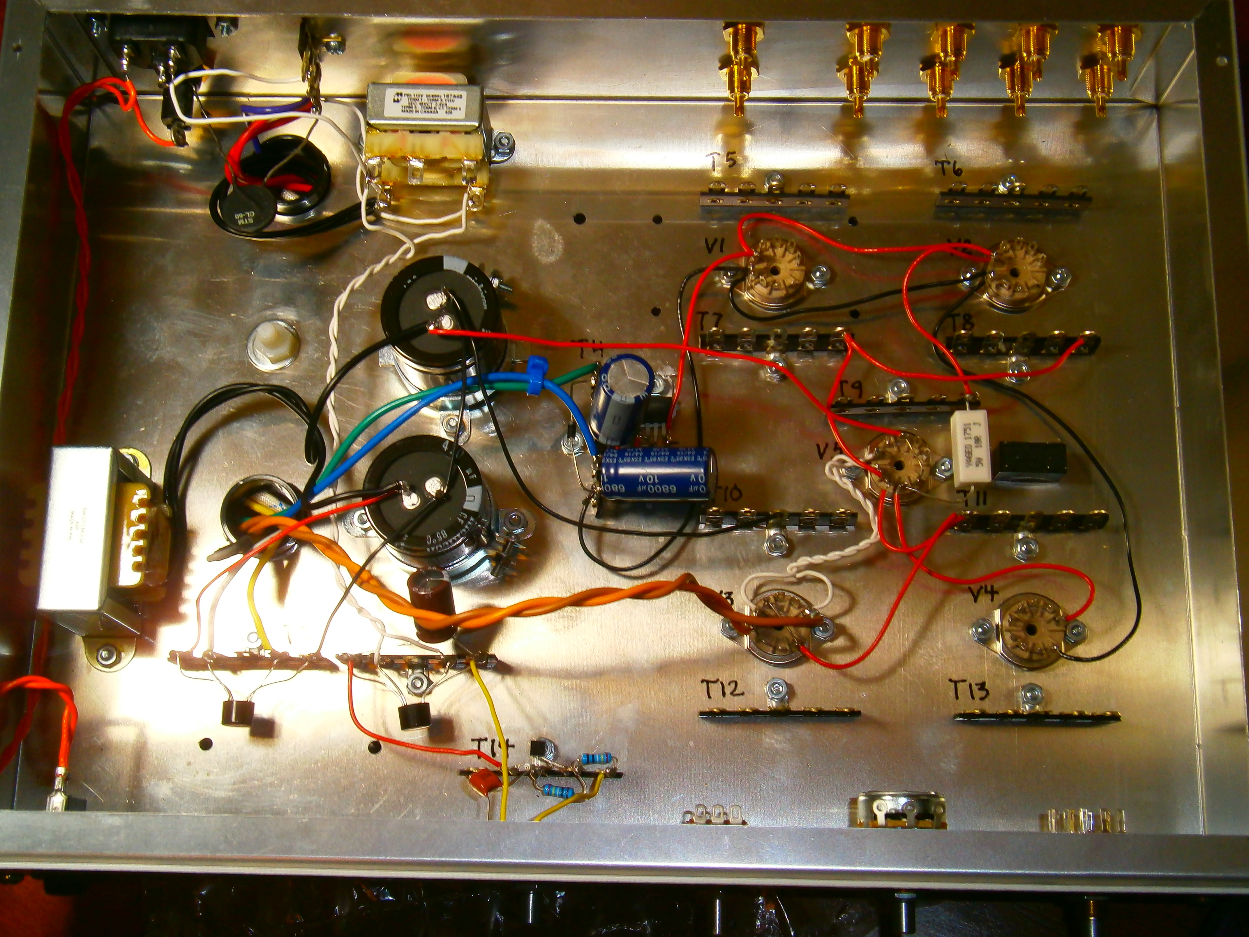 About halfway done, whew, doing point to point wiring is time consuming and sometimes exasperating getting wire crimped over the solder lugs. It's been close to 20 years since I'd done anything like this. It becomes a learning curve again with the soldering skill. And...those wiener fingers again, makes things much harder.