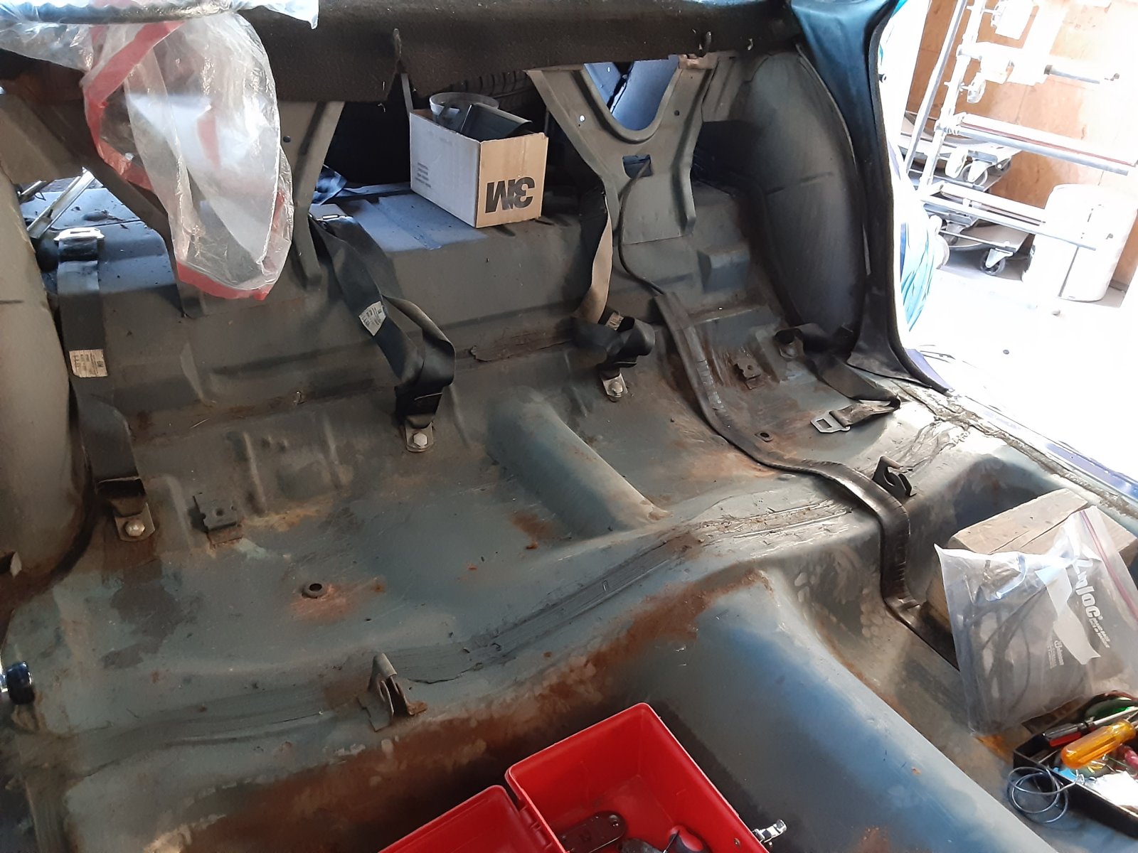 Last weekend, I cleaned the old carpet and pad out of the interior. Seats are already at the upholstery shop. Ran the stereo wires from the dash back to the trunk, putting them in the factory conduit which runs under the carpet. You can see it here running along the floorboard; It's the black ribbon looking thing on the driver's side floor: