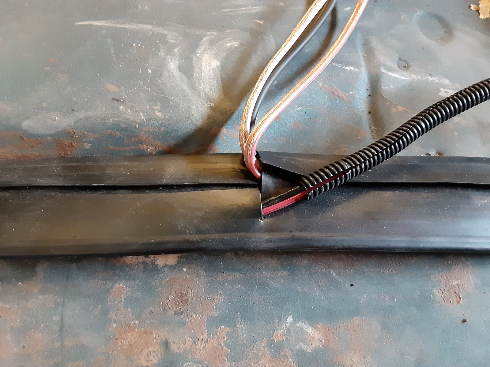 Here's a close-up of that conduit for the wires running from the dash to the trunk. That's the original part. I didn't know I'd find one there, and was planning to run my wires through some kind of protective cover. But I found this already there, so I ran my wires through it. This photo shows the section around the middle of the conduit, right under the front seat: