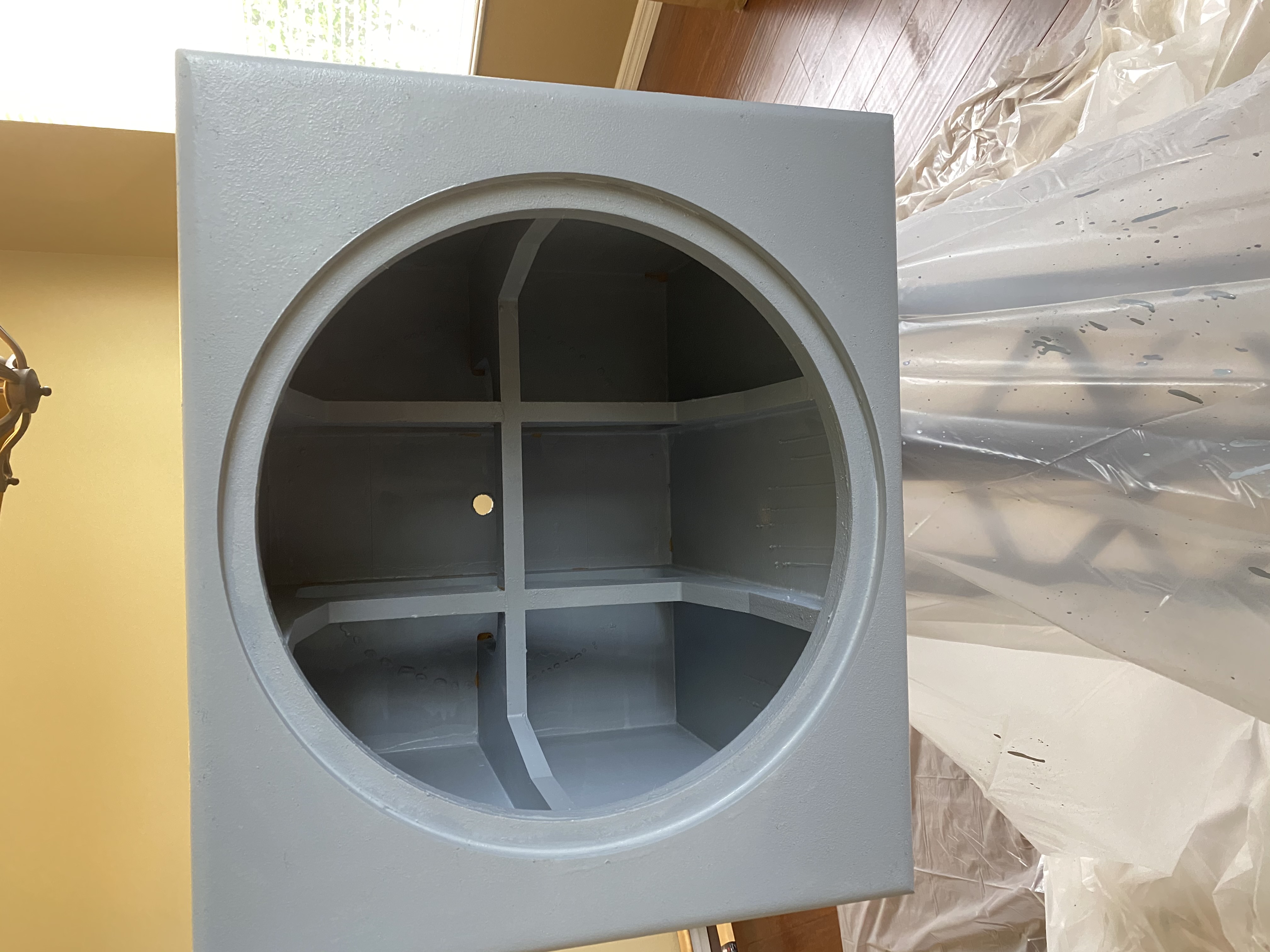 Next was some sanding. I chose to use an orbital sander with 80 grit to knock the overhang of the baffle off and really get the MDF smooth. As my previous painting training has taught me the prep work is the dirtiest and certainly the most important for the final finish. I used BIN Primer that I had tinted as a white base with black Duratex going over didn't make any sense to me. I did one coat of BIN then sanded with 120 grit and repeated.