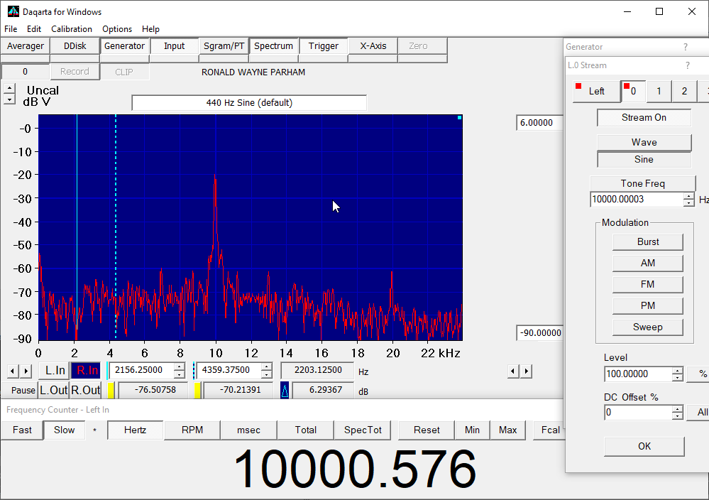I did that for a while, and then decided to create a dual-tone signal that combined the 315Hz sine with the 10kHz sine. I monitored the output with Daqarta's spectrum analyzer so I could see both the 315Hz content and the 10kHz content. That made it easier to set the levels to match. Then as a "sanity check," I used single-frequency sines of 315Hz and 10kHz to make sure the levels were matched when a pure sine wave was presented.
