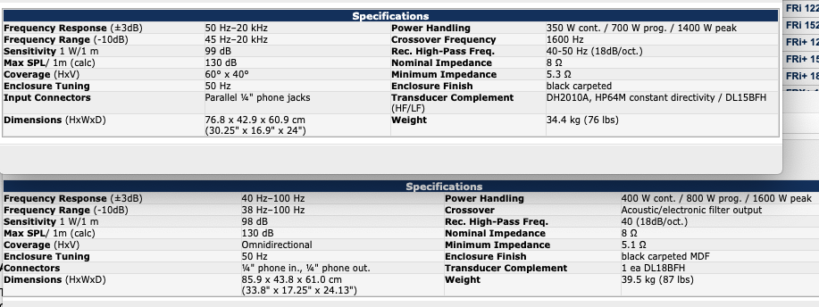 This is a screenshot of the specs from both of them, the 15" full range specs is on top, do you think the 18" Sub version might work better for me please?