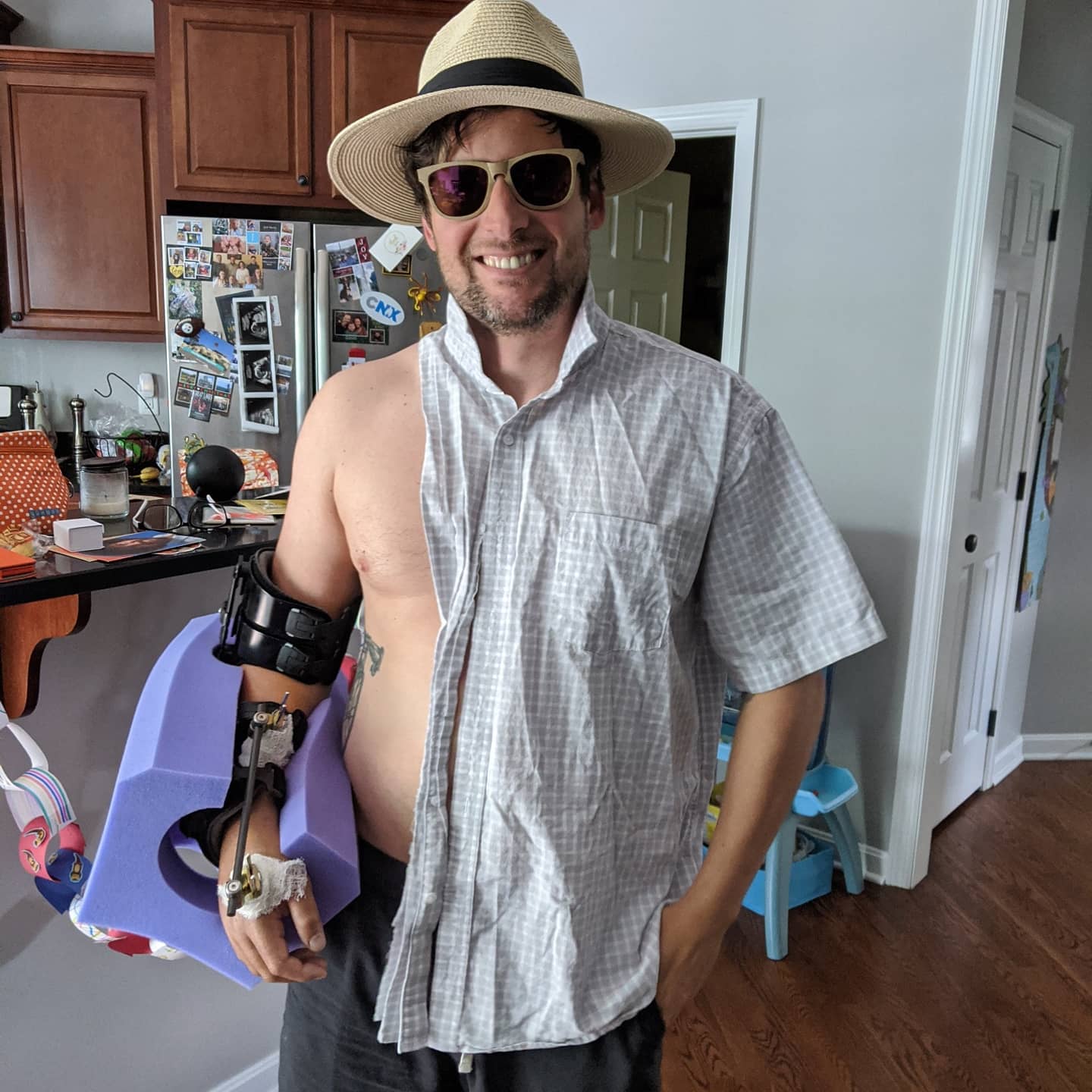 We arrive and my forearm looks like a sine curve and the bone is sticking out the bottom. The triage doctor takes a look at me and says, this might be above our paygrade here so let's get you downtown to where the real carpenters are. They set the bone that night and, in the morning, I have surgery and get external fixators put in.
