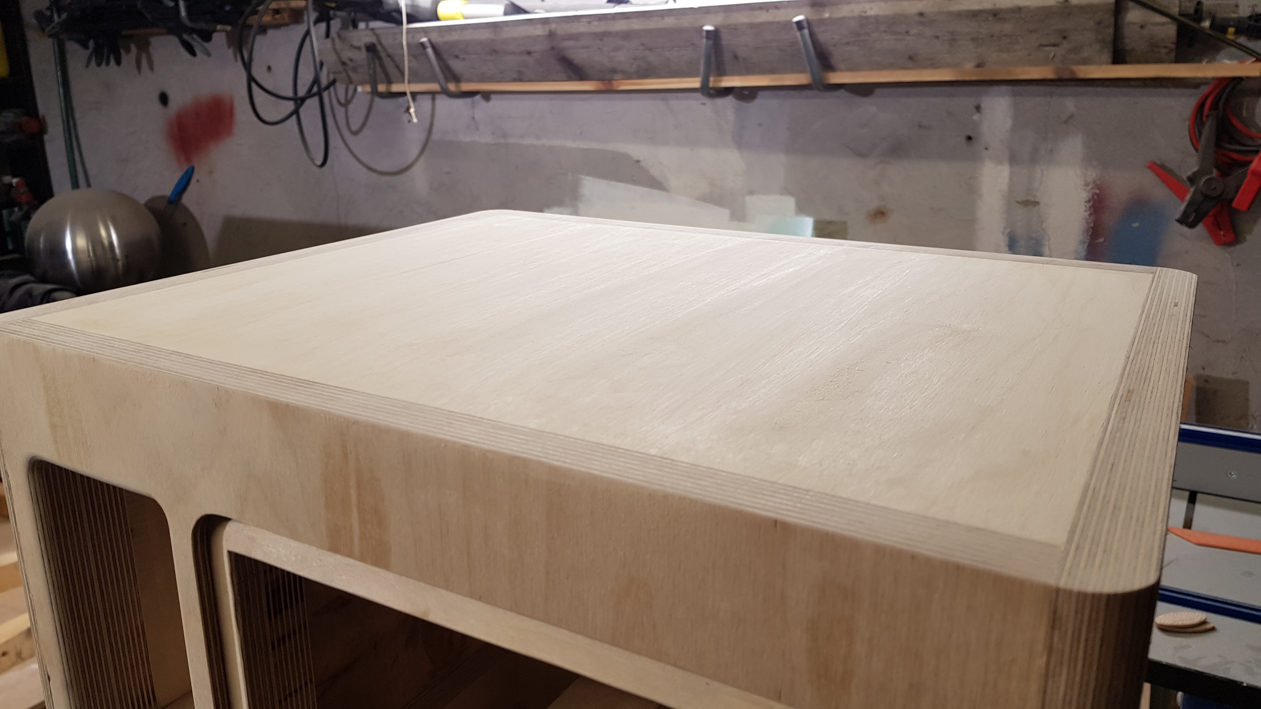 First sanding of top after side panel assembly. A good start. Side panels were rounded off with a roundover bit with same radius as the plywood thickness. Had to practice on several pieces to find the right router/feeding speed. It is damn easy to get burnmarks. This was done on my routertable to ensure stable feeding and guiding.