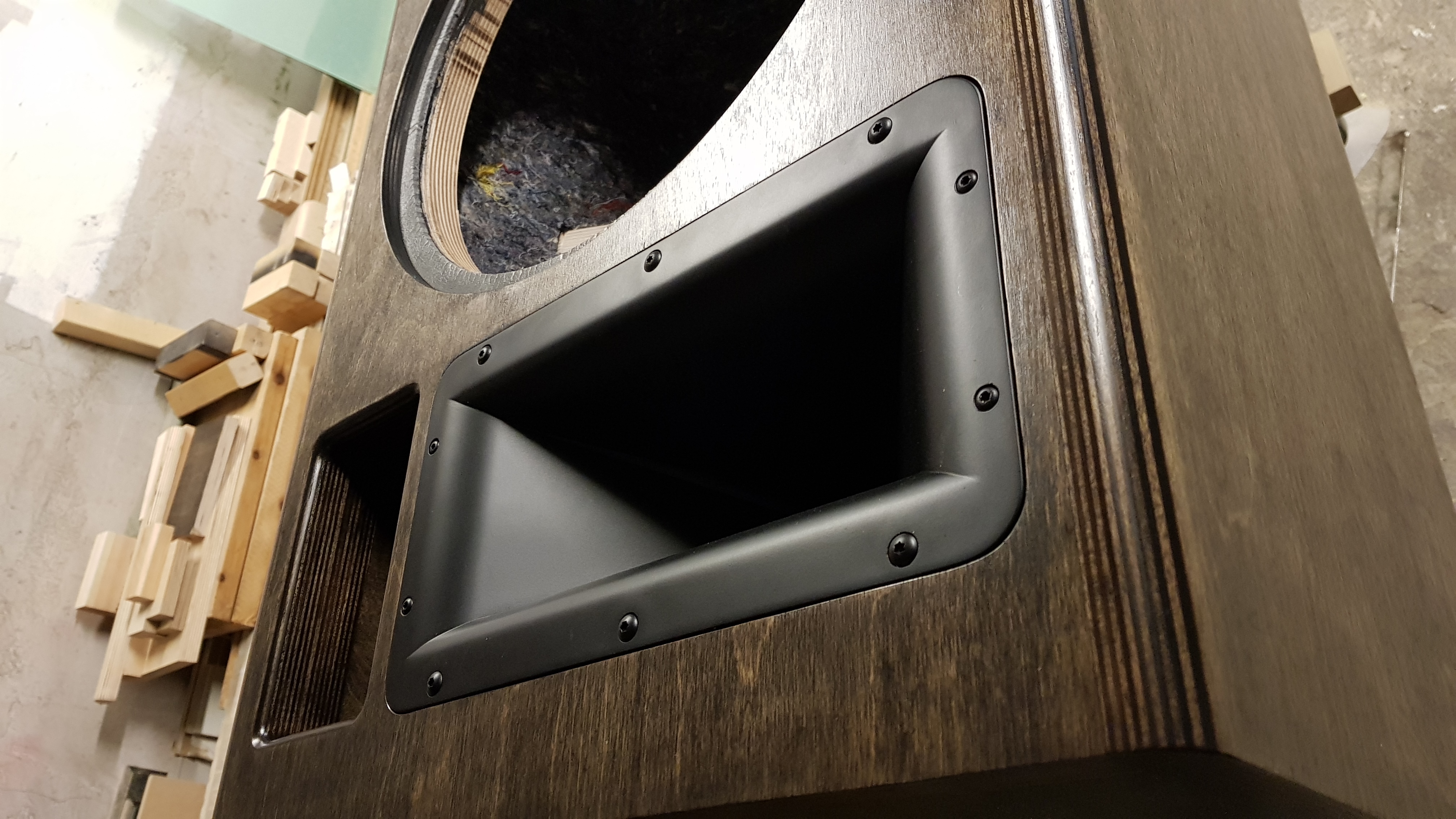Horn mounting. Tight fit, and flush. Made two extra holes on the sides of the horn just to be sure. The horn itself is damped too.