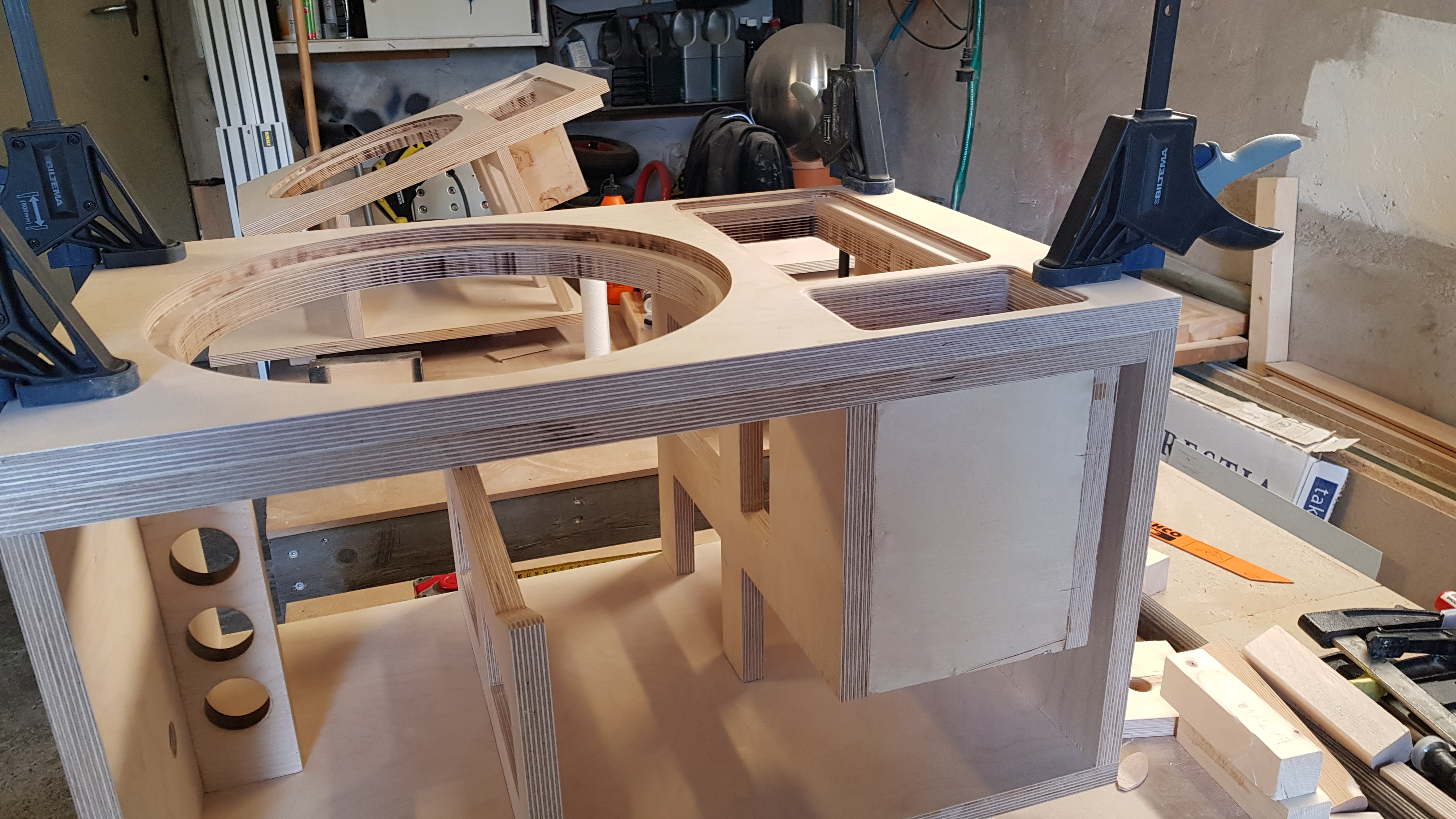 First sanding of top after side panel assembly. A good start. Side panels were rounded off with a roundover bit with same radius as the plywood thickness. Had to practice on several pieces to find the right router/feeding speed. It is damn easy to get burnmarks. This was done on my routertable to ensure stable feeding and guiding.