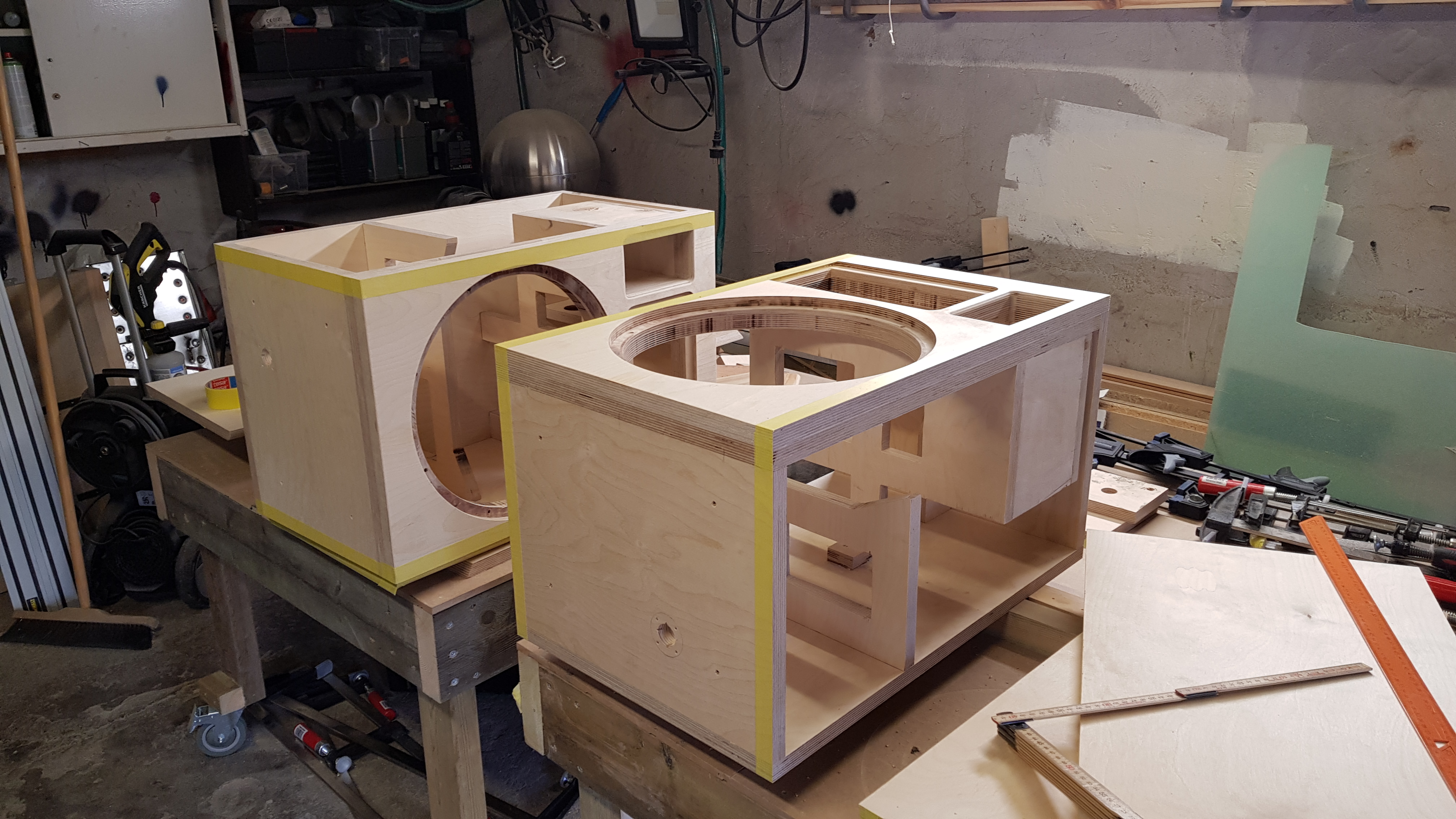 Promised some updates, and here it comes. Decided to finish the stands first. The bottom is made of two layers 21mm birch plywood, and the top is single plate. Top plate is tilted 3 degrees. I used two sheets plywood and it was just enough for speakers and stands.