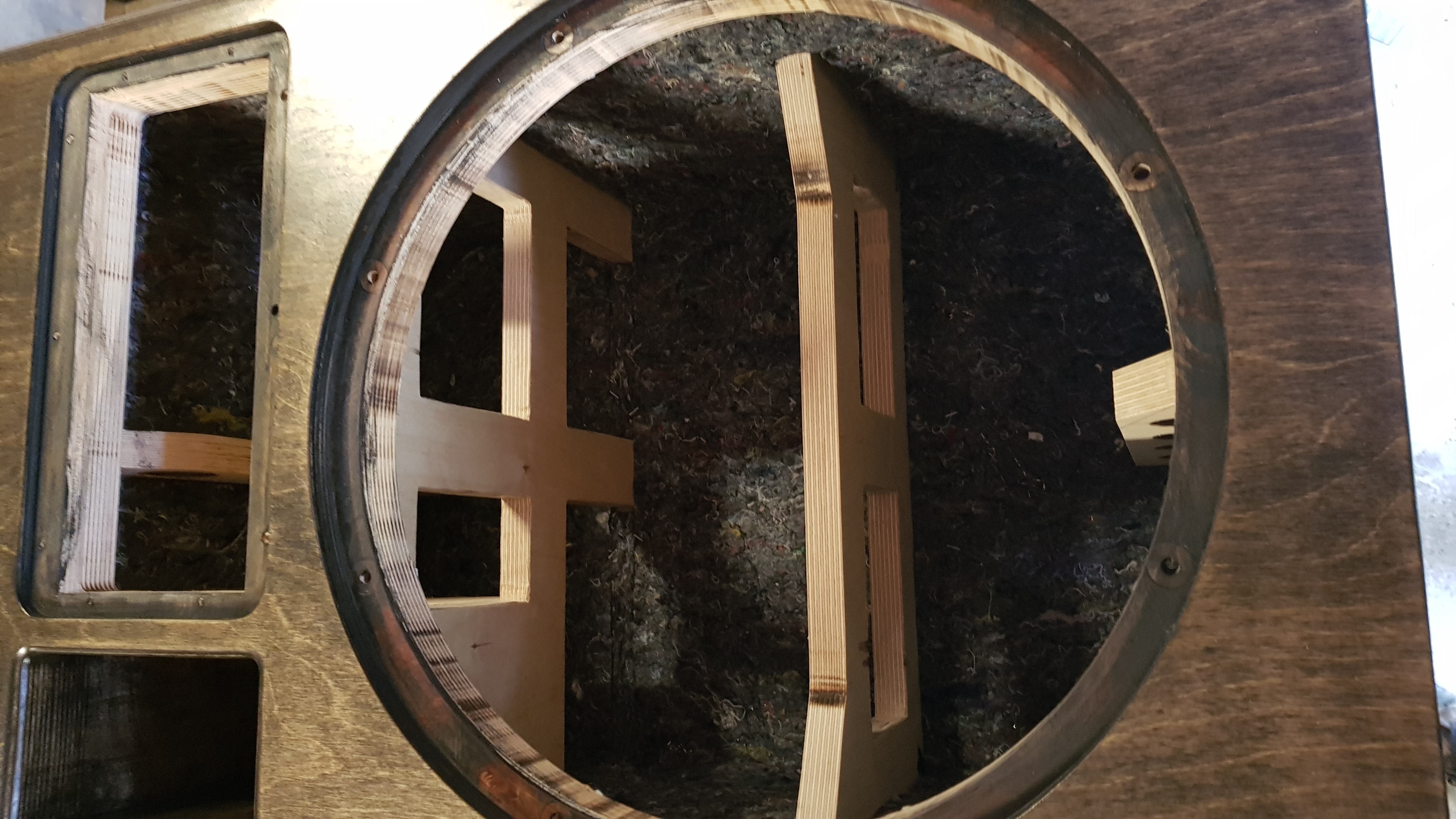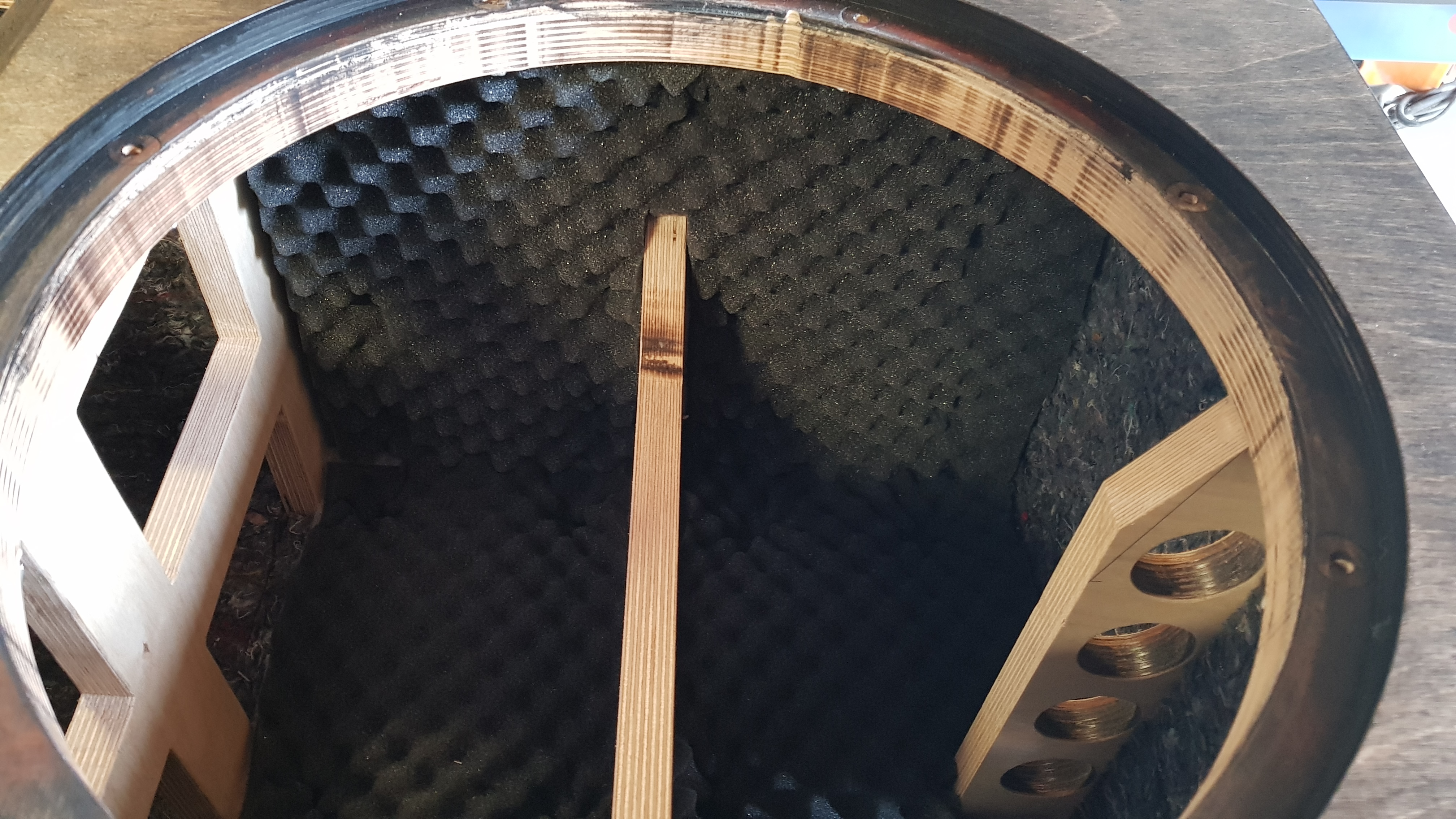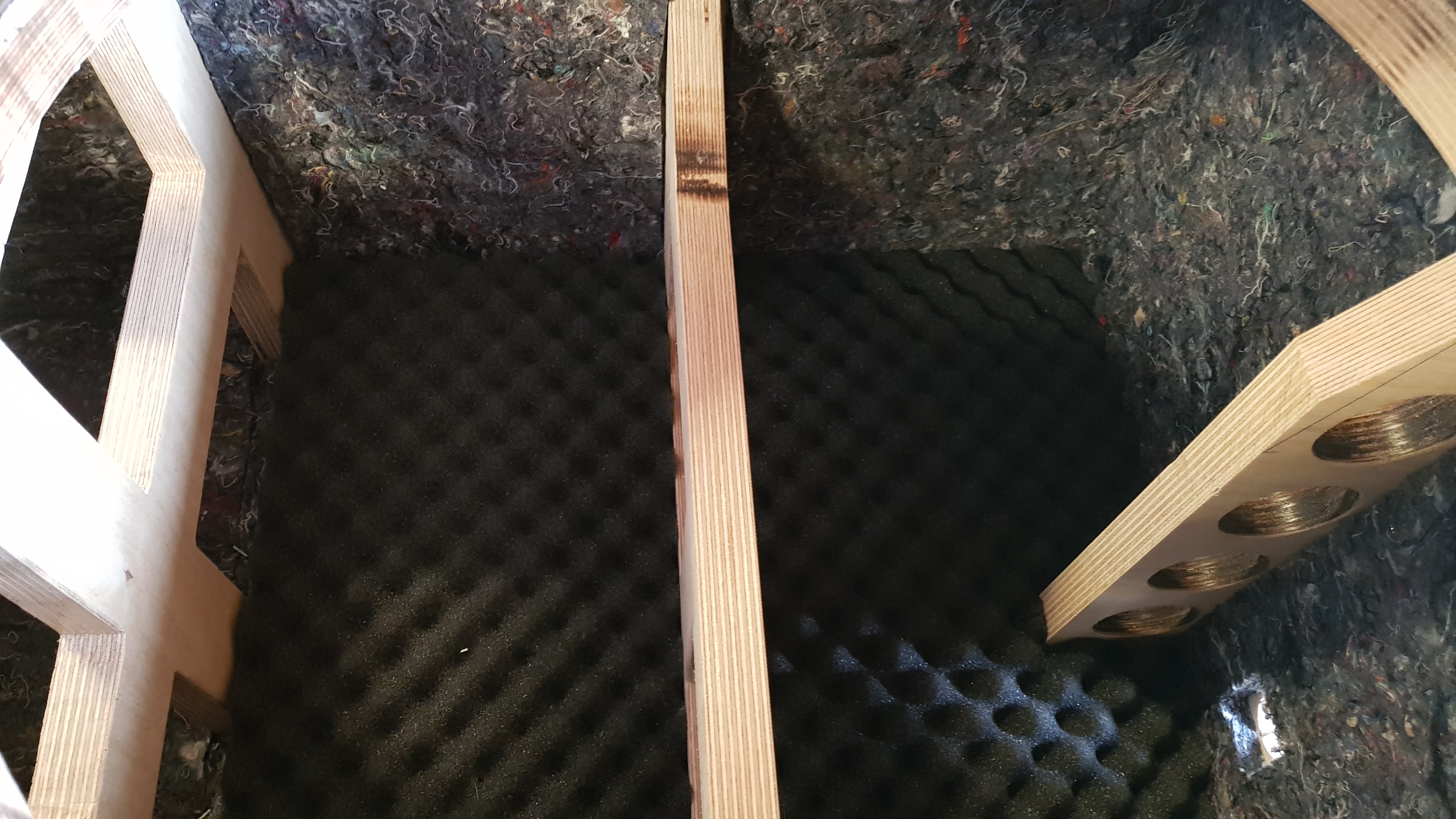 Behind the woofer below the top brace there are two layers more. One sheet with the white stuff which is very airy, and classic foam type on top. So three layers in total behind woofer. Had this laying around from earlier projects, but I believe they will give a good combined effect.