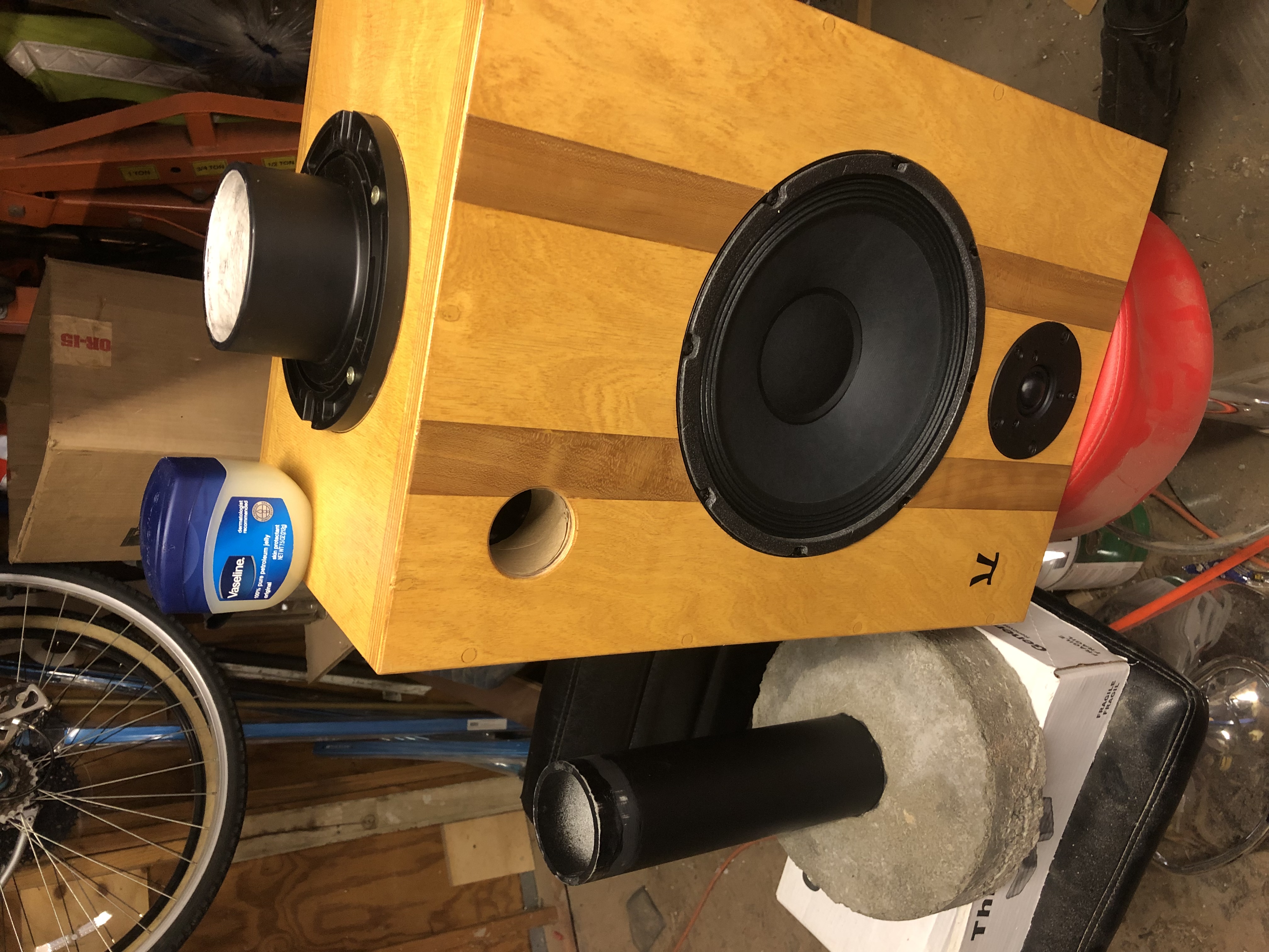 What's funny (and unintended) is the toilet closet flange mounted under the speaker... it works perfect for adjusting the speaker toe in.