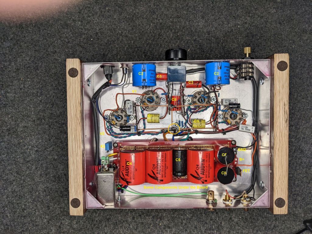 As the photos show I used mostly budget audio grade poly caps for power supply filtering. The single 100uf electrolytic was necessary to get the hum down enough. I tried several other locations and various filter configurations and this worked best. The final stage is a FET capacitor multiplier. It worked best as the last filter. The heaters are raised above ground to protect the tubes.