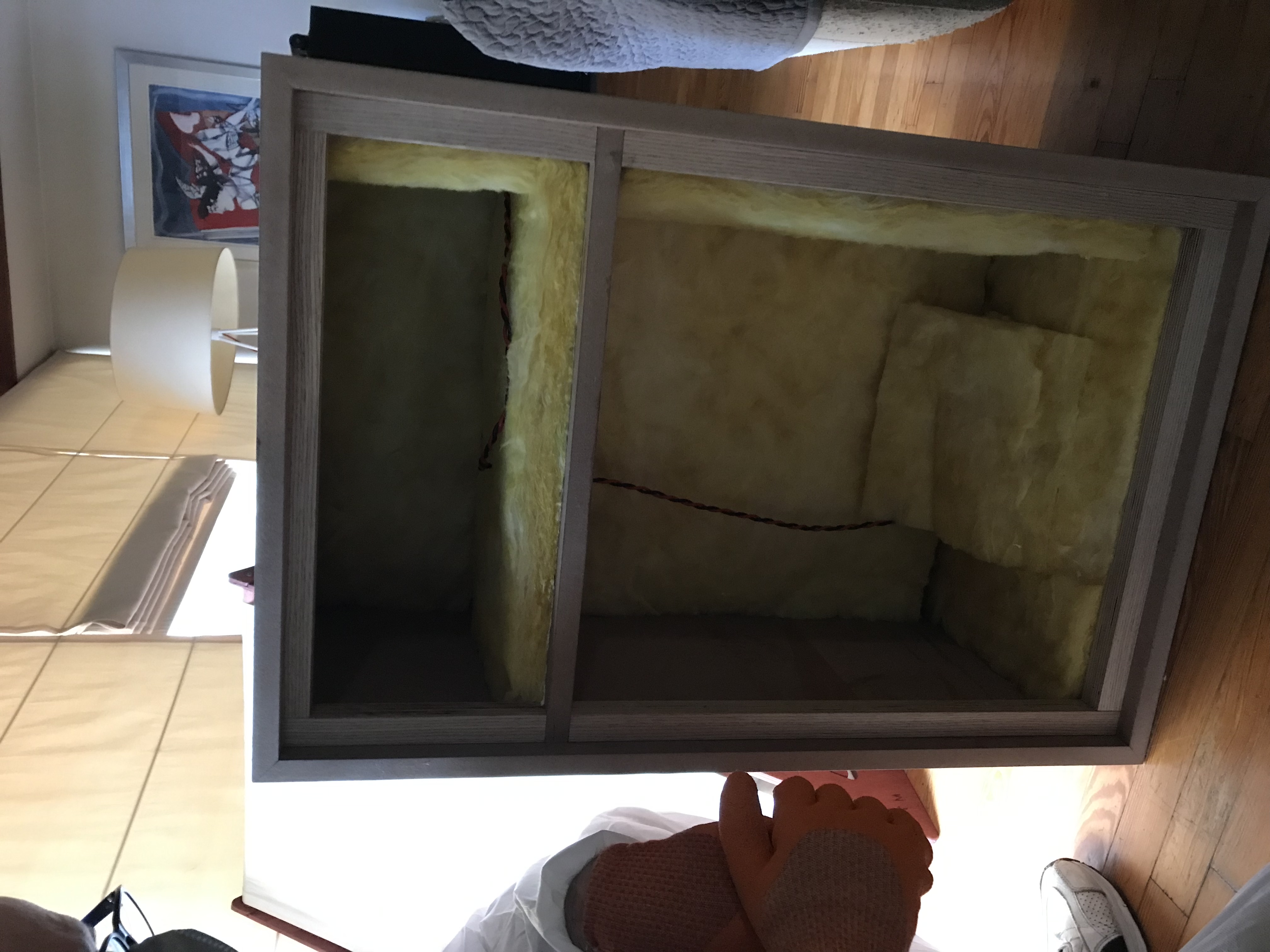 The insulation is also done. I hope I did everything correctly. In one of the speakers there is a gap of around 0.5-1.0 cm where the bottom back insulation meets the bracing board. I hope that's ok. The cable you see running is for the de250, obviously. I had the idea to put some duct insulation around it just in case it somehow bangs again anything hard inside.