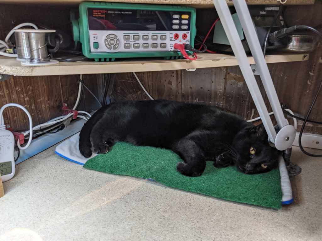 Yup...he sure does. He is an all black medium fur 13 year old that loves to hang out next to my PC when I am using it. About half the time he sleeps on the main area in front of the monitor. I fortunately have a second blue tooth keyboard and can still use the PC. About one time in five he sleeps so soundly that he snores. It is sort of a combination hum and whistle. He also sleeps under my one test meter as in the photo. He was trying to figure out what I was doing when I took that photo. Anyone else have funny animal stories?/forum/index.php?t=getfile&id=3270&private=0