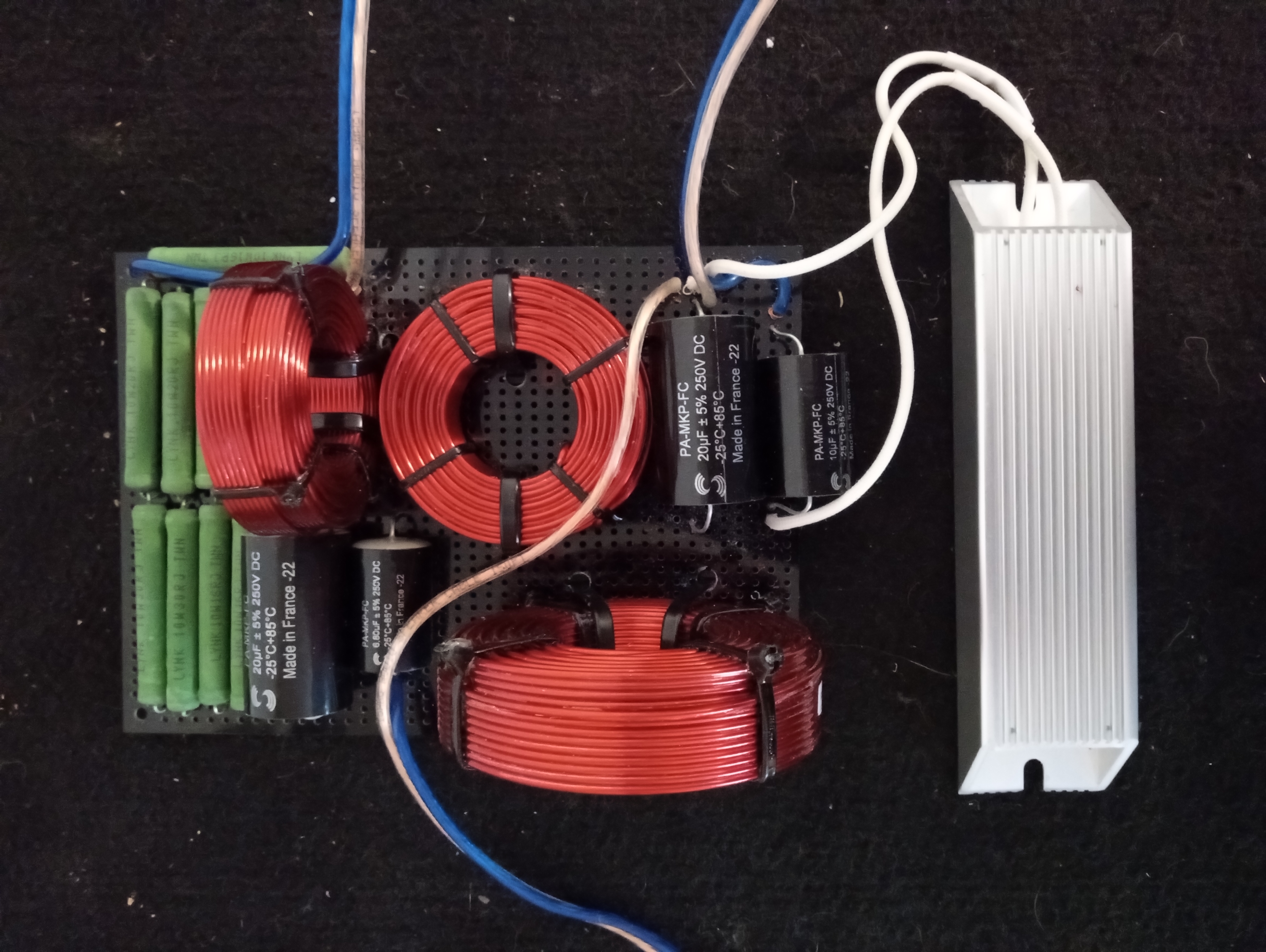 I have been making slow but steady progress. The crossovers are assembled and soldered. I ran out of black zip ties and had to use white ones for the second crossover, my OCD might take over and I will probably change the first crossover to match. The cabinets are mostly put together. My little router did not have fun cutting out the 1½" baffle, it definitely payed for itself so far on this project. I need to make the port tubes and cut some braces. Seal the boxes. Figure out grills. Pick out some venner, and get them completed.