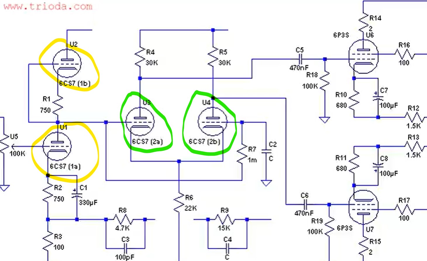 gofar99 wrote on Thu, 13 April 2023 22:00Hi, That is a good question and not clear from the schematic. But since there are two tubes per channel I would expect the voltage amp stage to use the low power portions of each tube and the inverter/driver to use the high power sections. According to my RCA book the low power section if pins 6,7,8 and the high power one 1, 3 and 9. heaters are 4 and 5. I hope this helps. let us know.