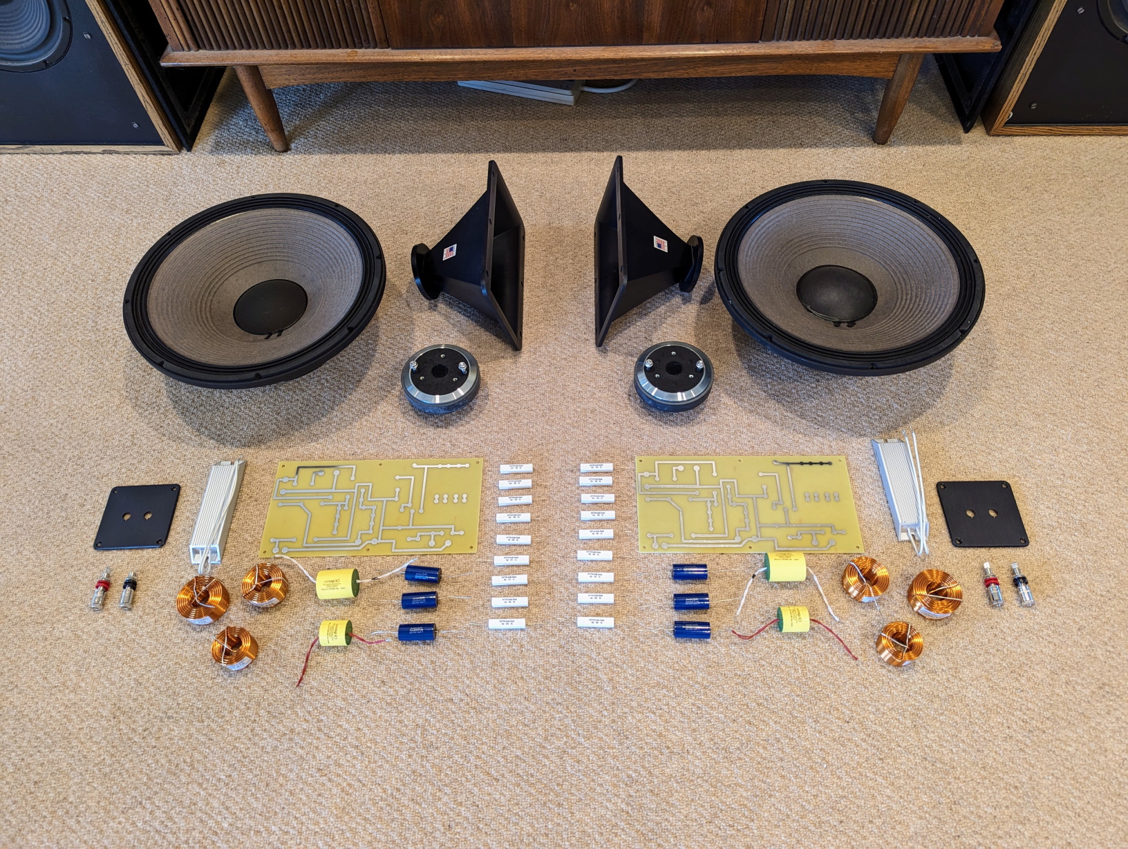 Wayne kindly provided the plans for the 4 Pi and I ordered the waveguides and crossover PCB's from him. I also took advantage of a few Labor Day sales and bought all the components I needed. I opted for a high end build with 2226HPLs and a pair of Denovo DNA-360's I had, which feature nearly identical performance and characteristics to the DE-250. The crossovers will use Auricaps for the high pass circuit and Z-caps for the low pass, and 15ga inductors all around. Resistors are the standard Dayton ceramic types, as I'm not convinced that resistors have a significant impact on the sound. I may still swap them to the Mills later on.