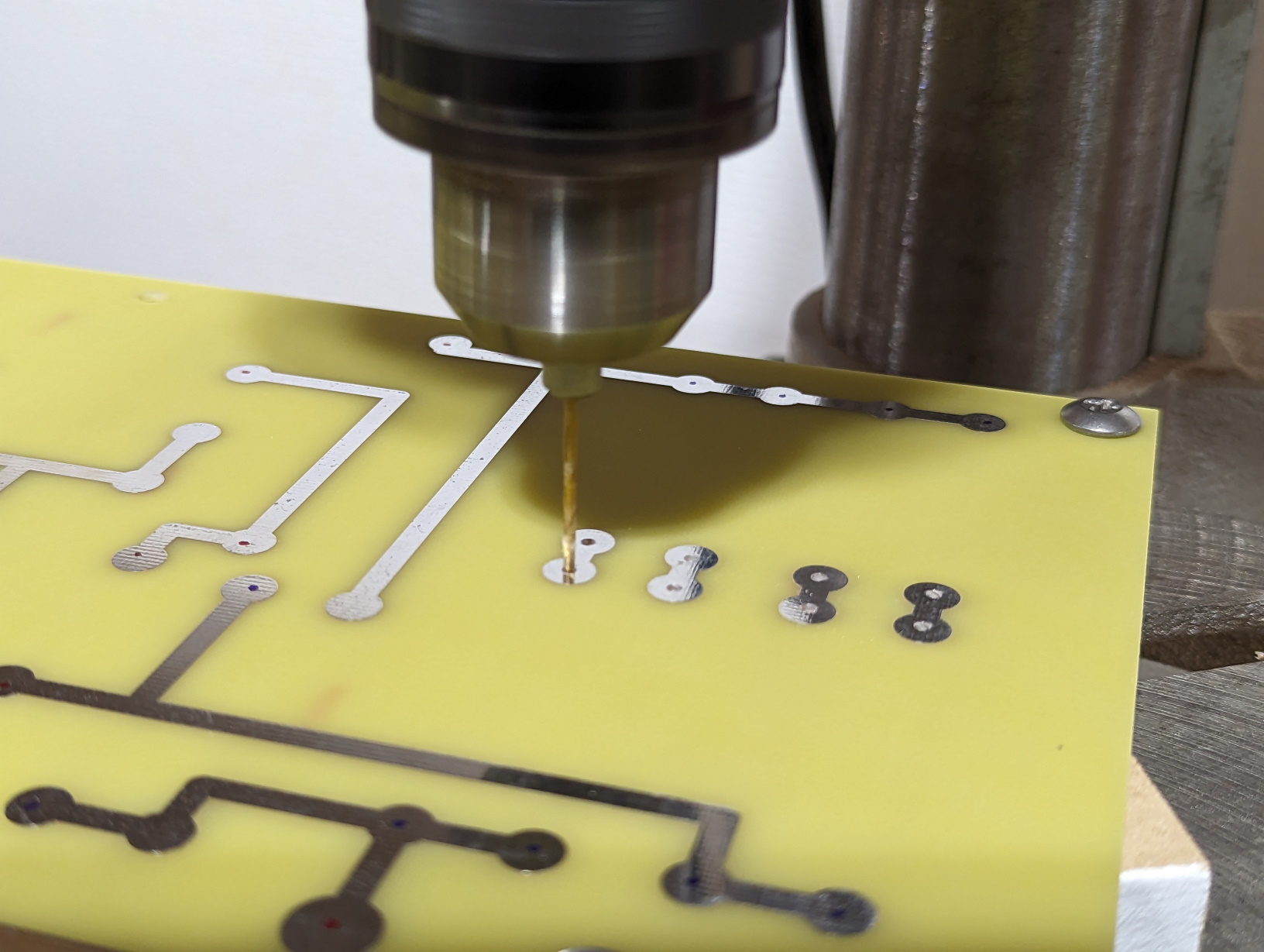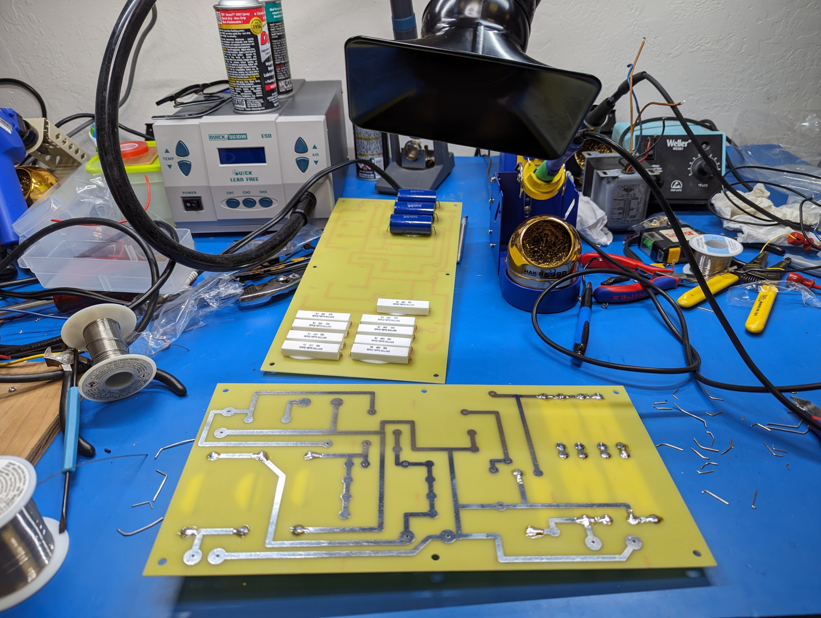 First order of business is to build the crossovers. I started by fastening both PCBs together and drilling holes in the appropriate spots. I used a 1/16" drill for the resistors and the Z-caps, and 5/64" for everything else.