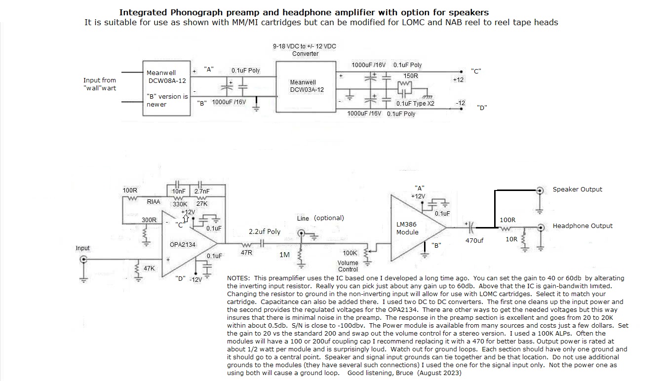 I really didn't need this so it is just a fun project. Very clean phono preamp paired with some small amps. It is somewhat modular as the amps and power supply are modular. The power supply is overkill for sure...but with phones any hum is really bad news. It can drive speakers as well and is rather loud. About 1/2-1 watt per channel. Cheap to build as well./forum/index.php?t=getfile&id=3343&private=0 /forum/index.php?t=getfile&id=3344&private=0