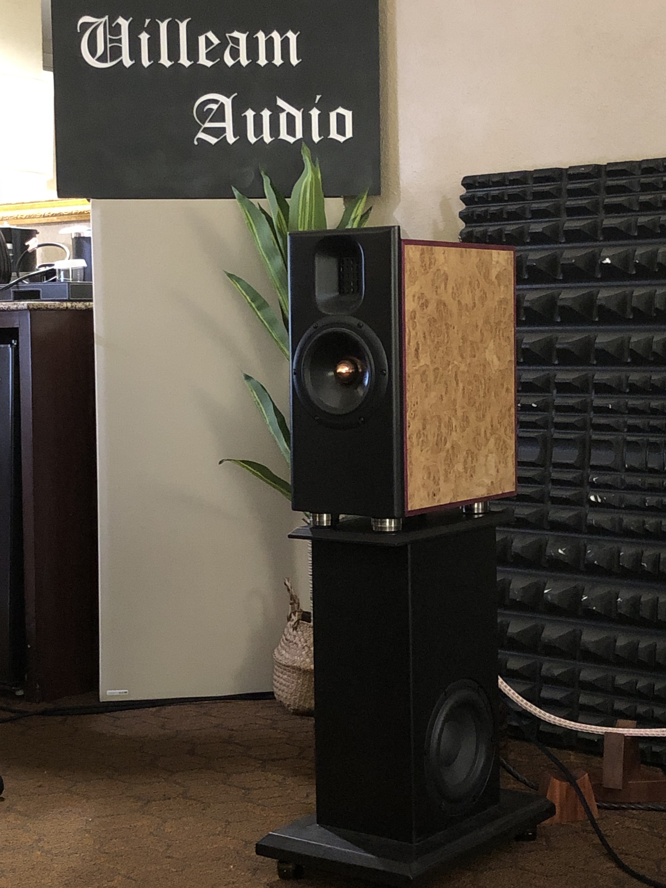 Mike Lundy of Uilleam Audio (https://uilleamaudio.com) describes the system he will demo as the GR Research NX-Studio Monitors paired with speaker stands, also designed by GR Research, that have dual 8" servo sub drivers built in. While the back of the stands is open, they perform like a slotted rear port instead of an open baffle and can therefore be placed much closer to the front wall than open baffle subs can. This preserves the ability of the studio monitors to be placed closer to the front wall while extending the bass of the studio monitors. Instead of starting to roll off around 70Hz like the monitors alone do, when combined with the sub stands, the roll off begins about 30Hz with a -3dB point around 27Hz. I say around and about because, while the servo drivers can play flat to 20Hz, the actual response at the listening position varies depending on the room and setup. Electronics are a full stack of PS Audio including BHK preamp, DirectStream DAC MK2, PerfectWave SACD transport, and M series amps plus the woofer stands' servo-amps in this bi-amped reference system. Photos show system tuning in Mike's listening room.