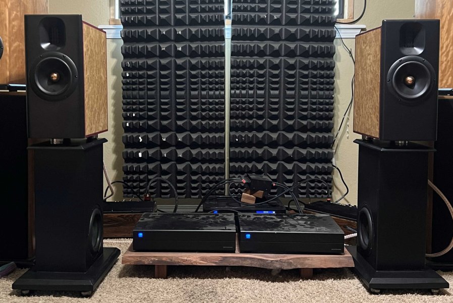 Mike Lundy of Uilleam Audio (https://uilleamaudio.com) describes the system he will demo as the GR Research NX-Studio Monitors paired with speaker stands, also designed by GR Research, that have dual 8" servo sub drivers built in. While the back of the stands is open, they perform like a slotted rear port instead of an open baffle and can therefore be placed much closer to the front wall than open baffle subs can. This preserves the ability of the studio monitors to be placed closer to the front wall while extending the bass of the studio monitors. Instead of starting to roll off around 70Hz like the monitors alone do, when combined with the sub stands, the roll off begins about 30Hz with a -3dB point around 27Hz. I say around and about because, while the servo drivers can play flat to 20Hz, the actual response at the listening position varies depending on the room and setup. Electronics are a full stack of PS Audio including BHK preamp, DirectStream DAC MK2, PerfectWave SACD transport, and M series amps plus the woofer stands' servo-amps in this bi-amped reference system. Photos show system tuning in Mike's listening room.