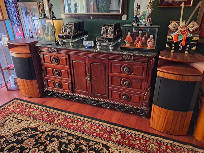 Here are Gilmore Raptor 500 amps driving JBL L110 speakers and my DIY 2A3 amp driving JBL C50 Olympus speakers with custom horns CNC'd from Bubinga.