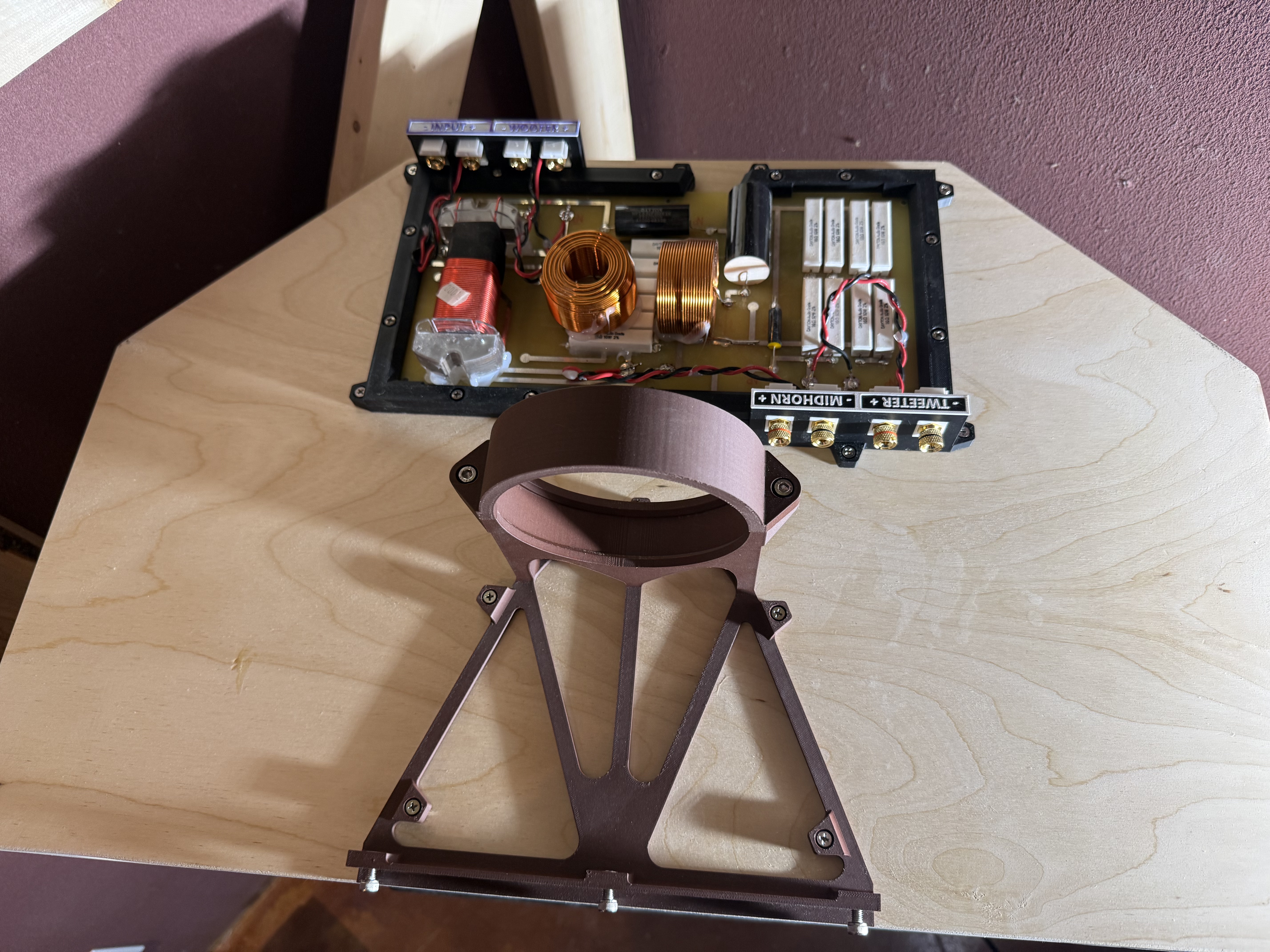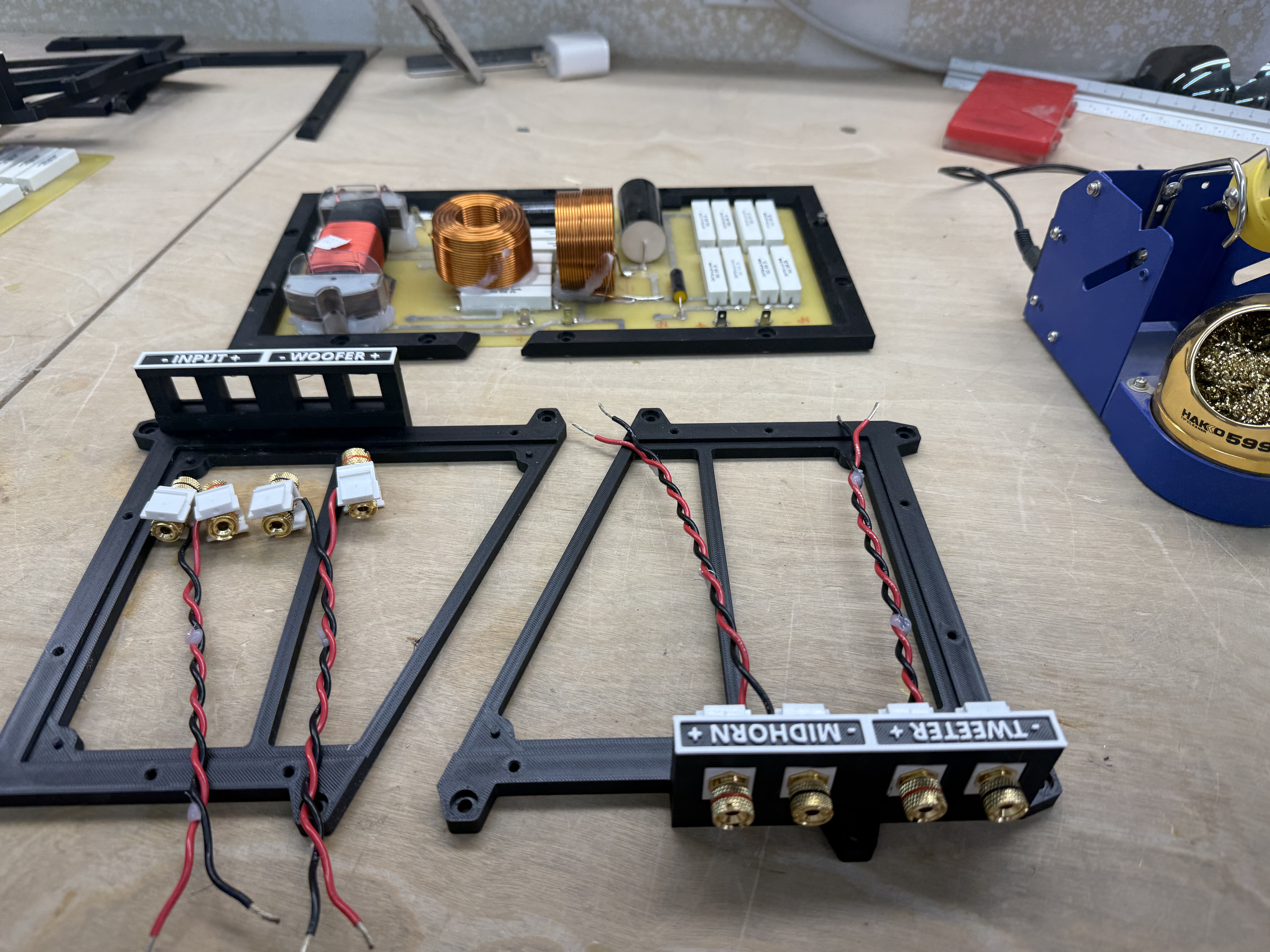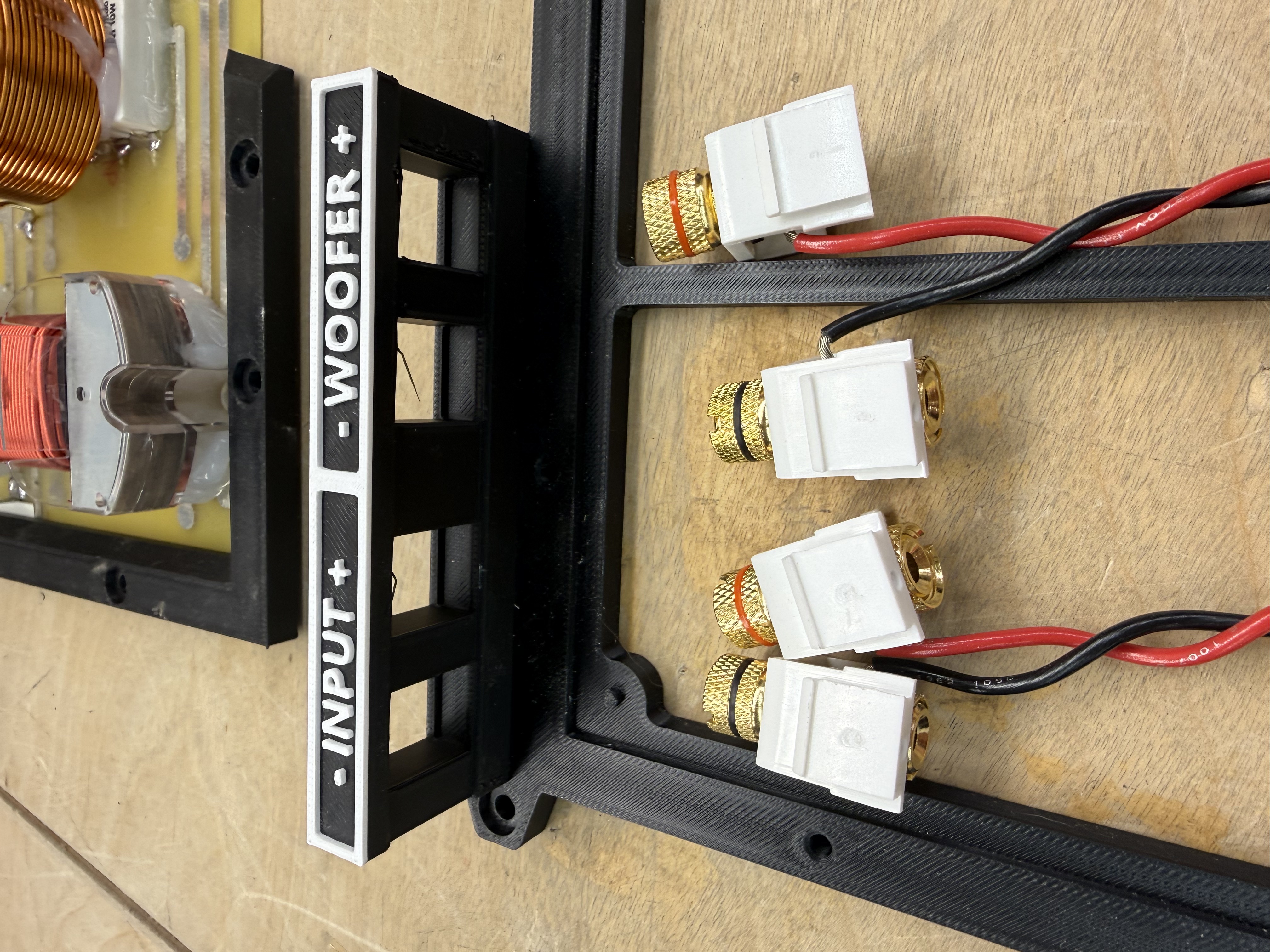 Here are a couple of closeups of the crossovers and mounting brackets that I 3D printed. I split the bracket into two parts to fit the print bed on my Bambu printer. The brackets have keystone panels for the banana jack inserts. I downloaded a print for the keystone panel and modified for this use.