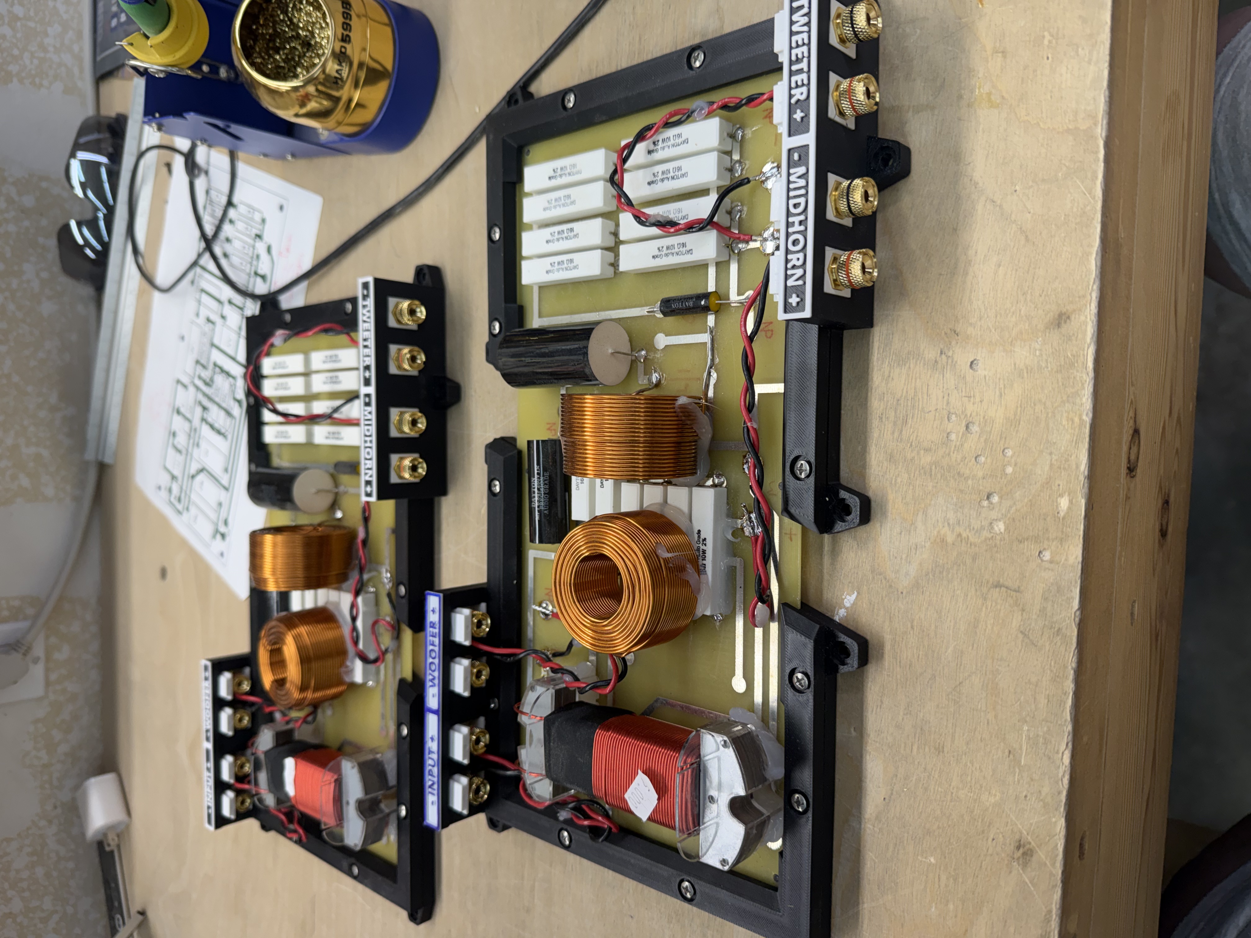 I had an error on one of the crossover boards that killed the output from the tweeter (see if you can spot it!). Once I got that sorted out I got to really hear these speakers for the first time.