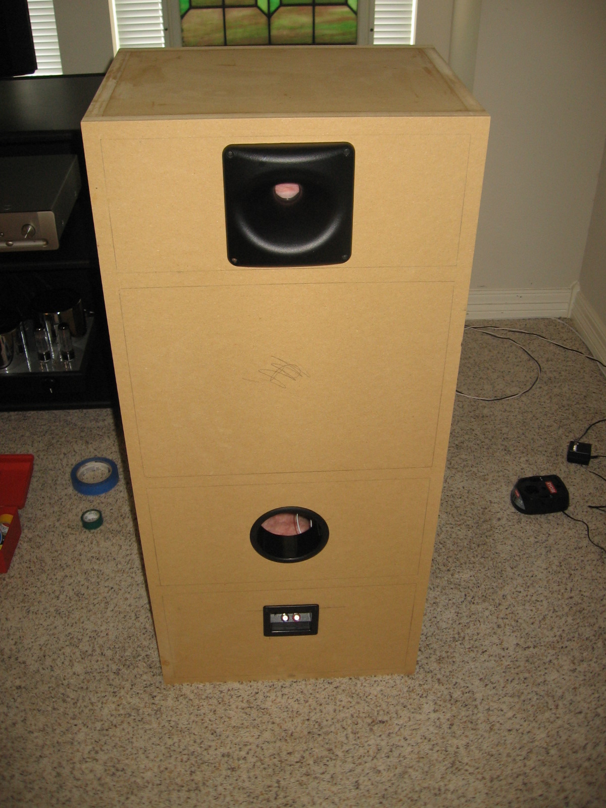 Here's a picture of the back of the new enclosures showing the waveguide, the 4" port and the speaker terminals. A miniature switch on the speaker terminals allows me to turn the rear firing tweeter on or off: