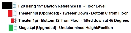Wayne: When you talk about me using the horned subs as a "distant flanking sub", do you suggest that I use the four Theater F20s on the west wall in conjunction with the stage sound? Would you then recommend a pair of 3pi Subs to accompany the Stage 4pis? If so, what placement do you suggest for the 3pi subs? I was thinking the bottom of the Stage 4pis could be positioned at a height of approximately 5', as that would (in my opinion) provide the best positioning for a standing audience. Would the 3pi subs (if their use is suggested) then be placed under the 4pis at floor level facing the audience? (It seems to me that the 3pi subs would also double as extra multi-subs for the 7.1 surround when playing movies, filling in any nulls created by our being limited to F20 placement. Thoughts?)