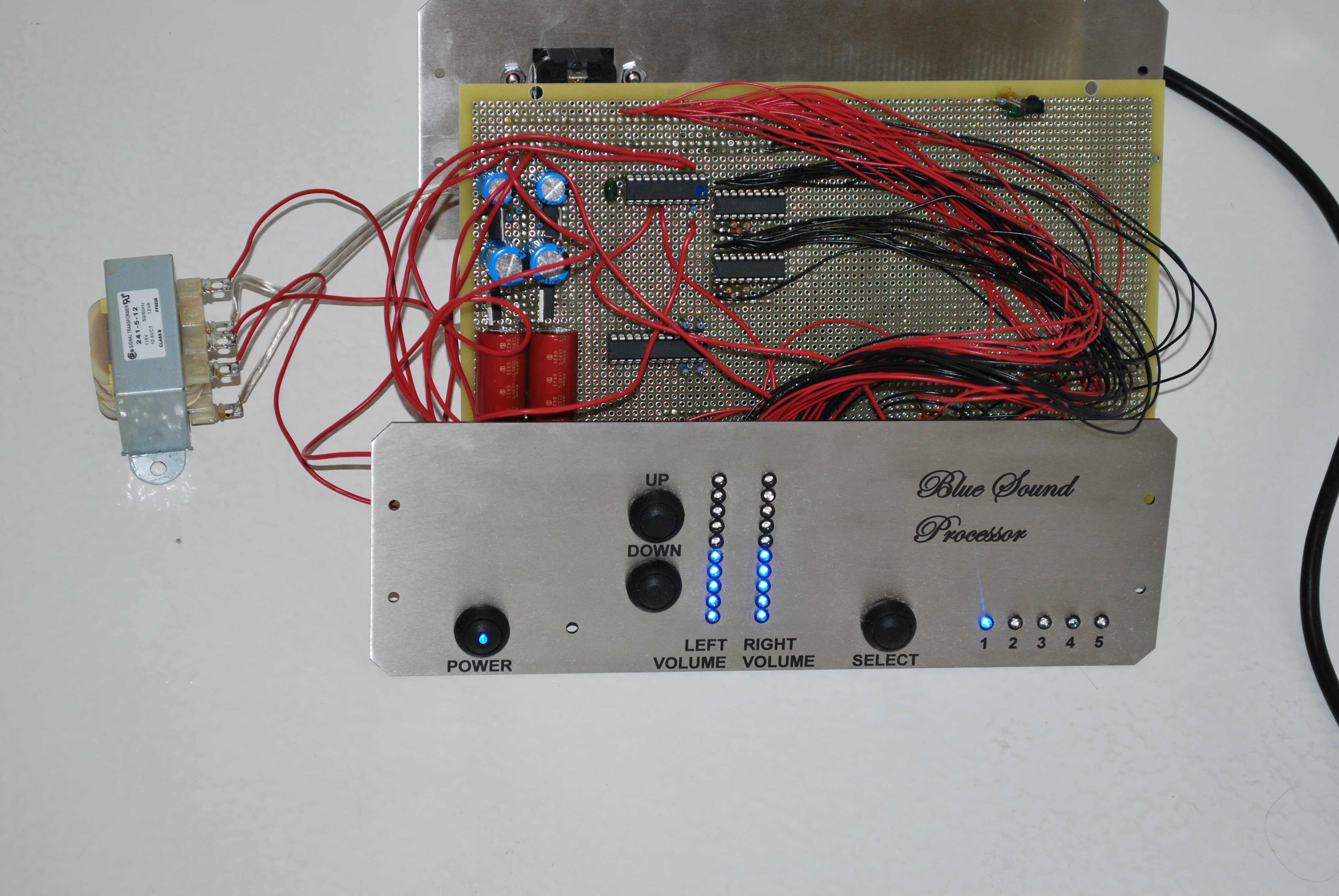 It's built and tested. I'm itching to put it in the cabinet and wire-tie that mess of interconnect and LED wires, but I probably won't get to that for a few days. Gotta hit the road tomorrow and won't be back 'til Sunday. But here's a view of the working circuit and the front panel: