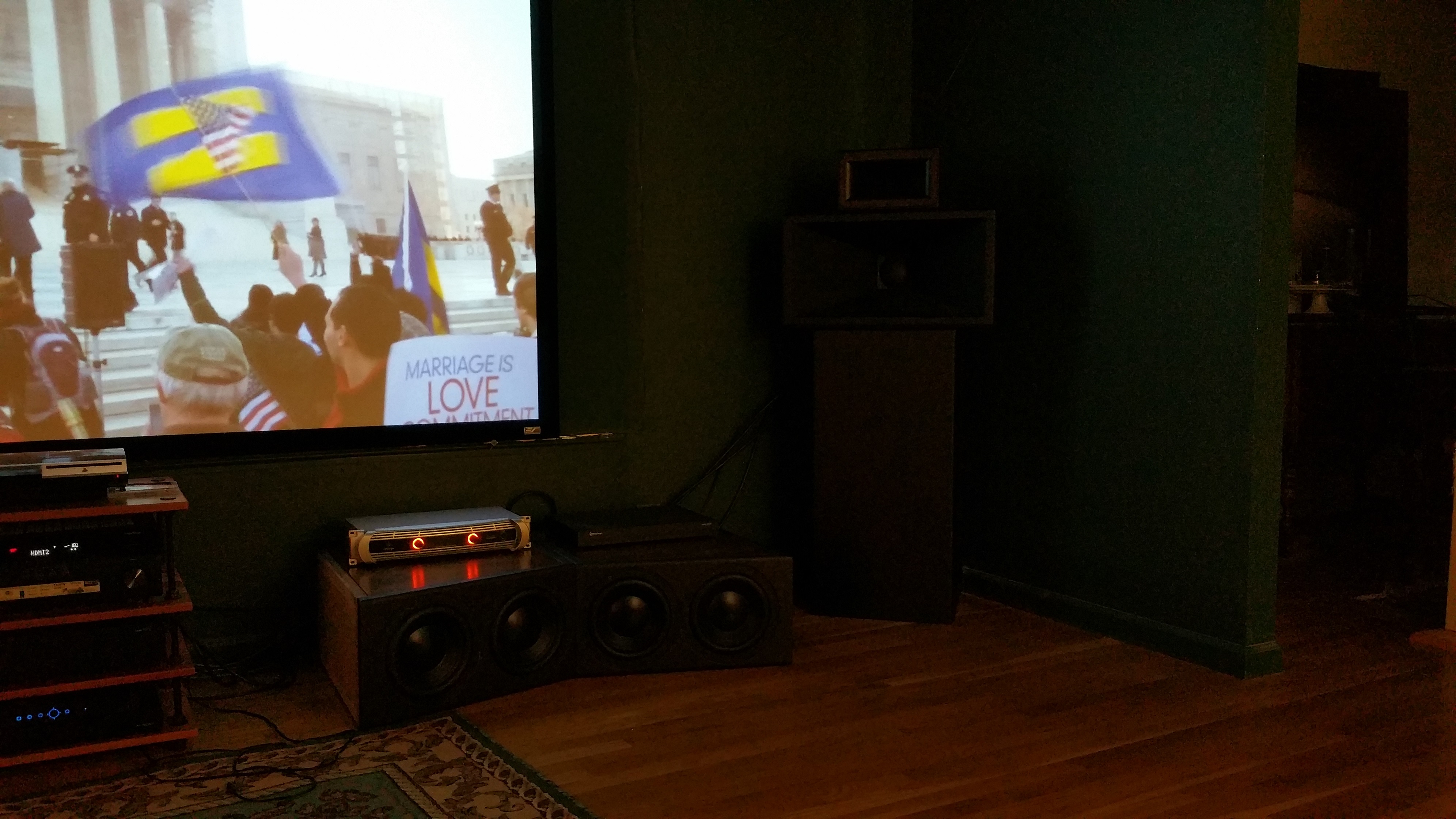 Because of the design of the subs, we had to lay them down on the front wall. They don't seem to do anything bad in that position. The sealed subs are flat to 24Hz and make crazy amounts of bass.