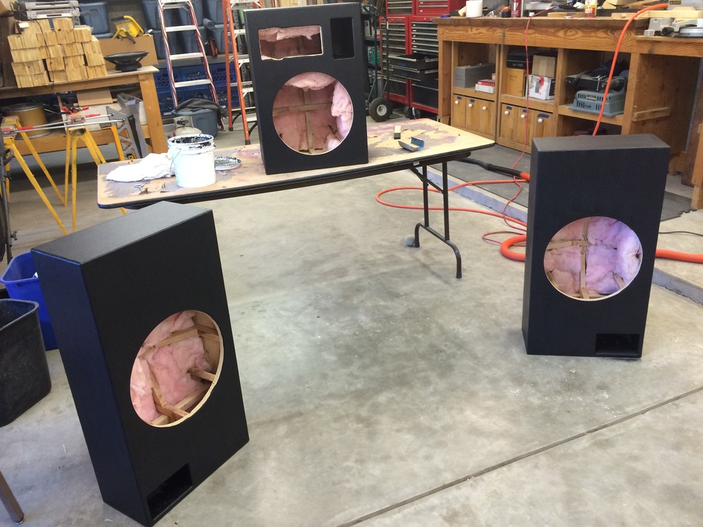 I finally got things moving again. The bass bins are done, now on to the mid horns.