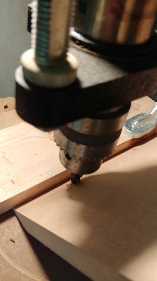 I clamped a fence to the drill press table, and drilled the holes for the miter joint screws
