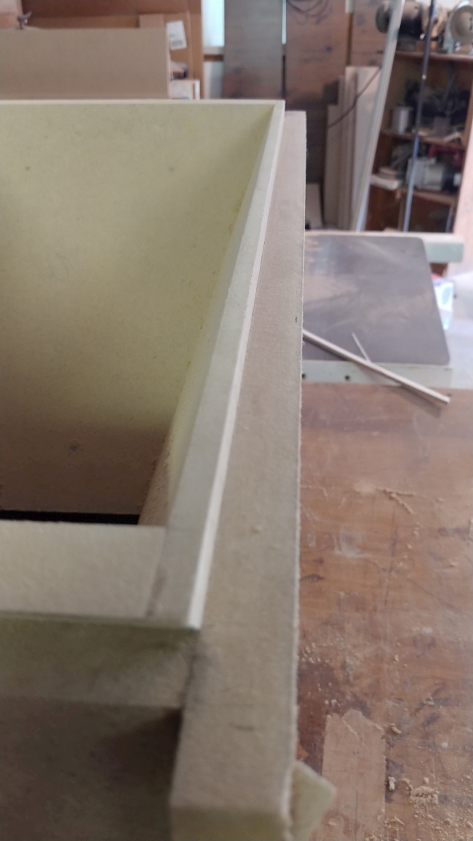 Once the flare is close to fitting, extra care should be taken to not split the box. MDF is a very weak material in tension, and you will split it with almost no effort. Patience is the key, it does not take any special talent or skill. Just check it often, wear a glove, and think happy thoughts.