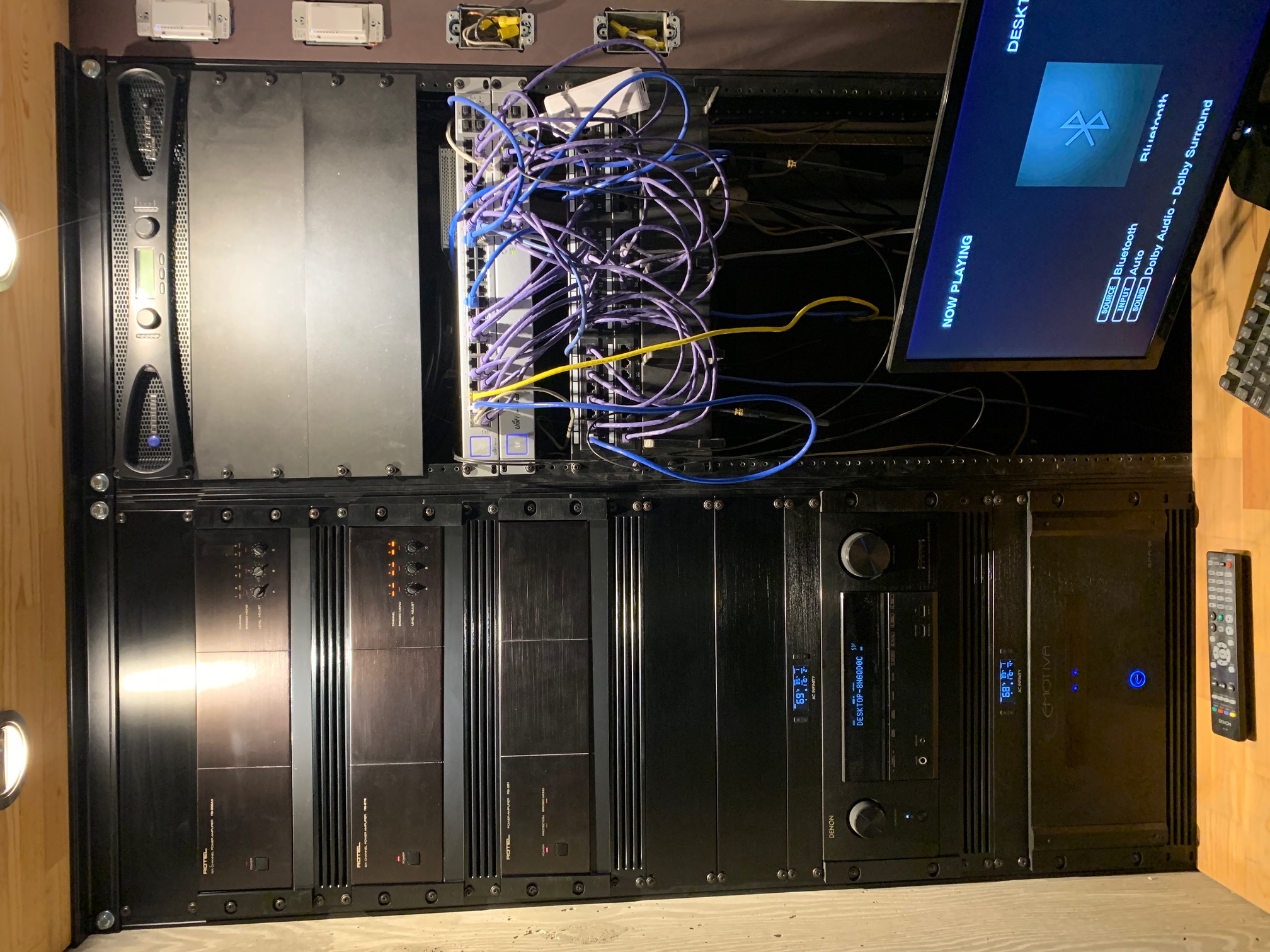 And the rack. I modified Emotiva rack mount kits for the Denon receiver and my Rotel amps that drive the speakers in my shop and yard. That mess of network equipment is moving into the closet behind the rack and I will install a shelf for my vintage Nakamichi gear. I will also rack mount my unRaid server and the monitor.