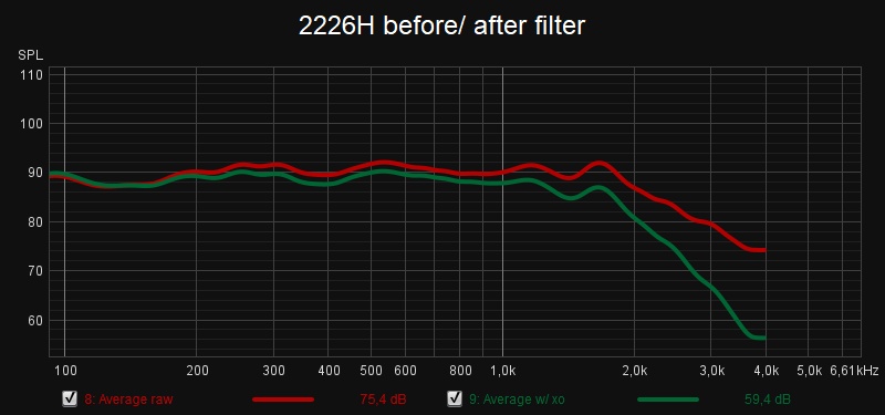 Made some measurements of the woofer before and after crossover. I got less noise when I laid the speakers on the floor. Called the guy who sold the woofers, and he insisted they were originals. He put his pride in this and said he had newer sold drivers with aftermarket recone kits. Made three measurements, with and without crossover on 0,25m, 0,5m and 0,75m distance. Averaged the three measurements for each case. It is smoothed 1/12 and has not got the resolution you get outdoors, but the general shape and location of the dips/peaks are consistent. Standing measurements show more or less the same. It is more useful to show the effect of the xo.