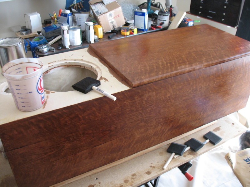 Those restrictions, together with the so-so quality of the veneer and a veneering issue I'll get into later, pointed toward using Watco, a Linseed Oil-based finish. The time factor also meant no fancy mixing of artists colors with the oil to make a custom color; I want to hear these speakers, not put'm in a museum.