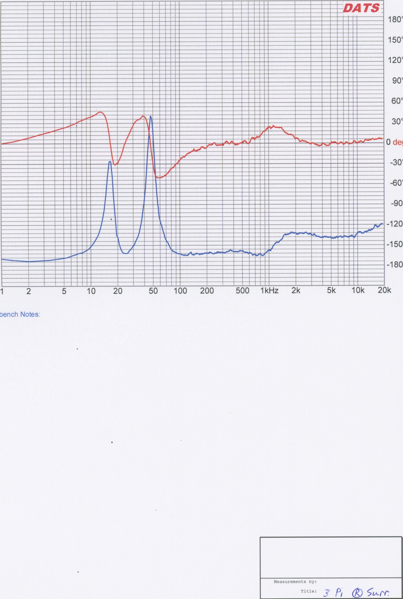 The 3 Pi surrounds, slightly modified 3 Pi center and 6 Pi main loudspeakers in my home theater all use the AE TD12S. This evening the impedance of each was measured with a Dayton DATS system. The 3 Pi curves appeared to be essentially identical and, similar to the 6 Pi curves, reveal no discernable anomalies at the 750, 1500 or 2000Hz frequencies from the previously posted plot. The impedance graph from the 3 Pi right surround is included for review. The averaged 1 meter response curves on the tweeter axis for the 3 Pi and 6Pi show smooth midrange responses using the Dayton Omnimic. The room curves at 3 and 4 meters also lack any significant anomalies, the waterfall plots look good and the distortion through the midrange appears to be below the noise floor of the room (<0.5% at 95 dB/1 m). No evidence of cone breakup at all! These examples of the TD12S woofer range from less than one to about 3 years old and all demonstrated tight clustering of T/S parameters measured during the construction phase of the projects. The rough response posted doesn't correlate with my measurements or listening impressions. There is obviously a disconnect somewhere in all of this.