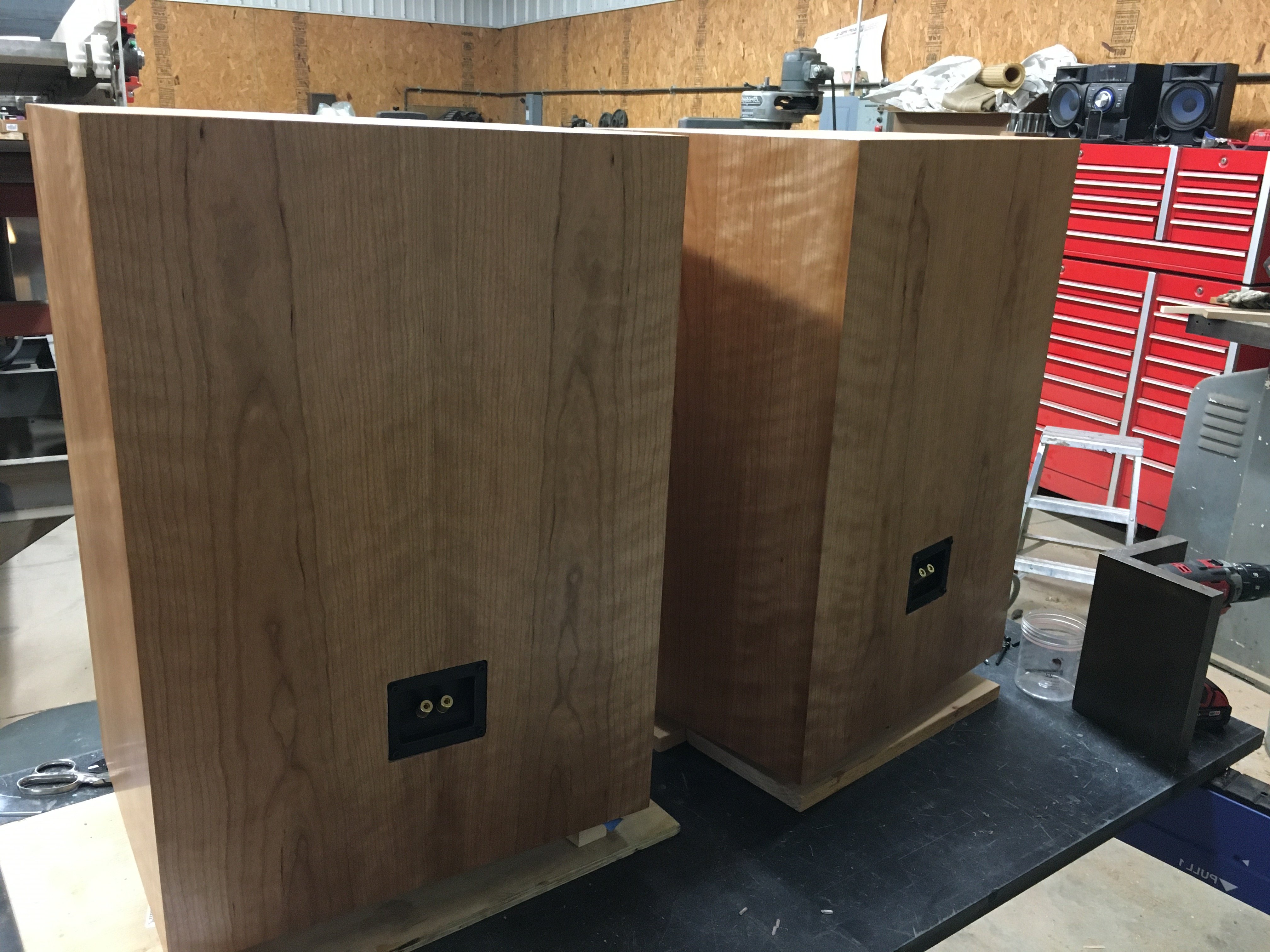 Took a lot of looking but found a cherry board that was figured similarly to the cherry veneer I'd selected. Trimmed out the cabs with a vintage feeling facet (sansui?).