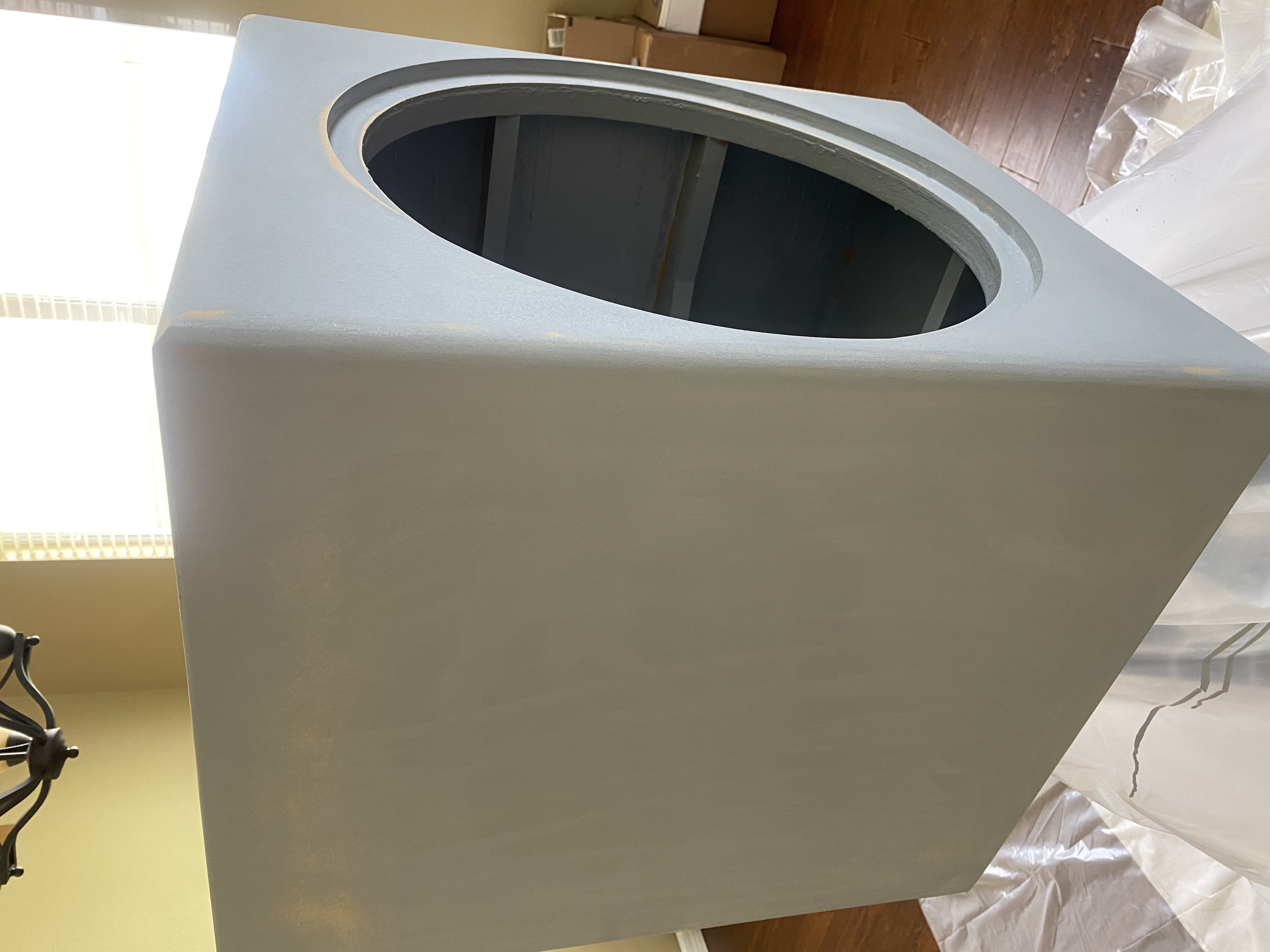 Next was some sanding. I chose to use an orbital sander with 80 grit to knock the overhang of the baffle off and really get the MDF smooth. As my previous painting training has taught me the prep work is the dirtiest and certainly the most important for the final finish. I used BIN Primer that I had tinted as a white base with black Duratex going over didn't make any sense to me. I did one coat of BIN then sanded with 120 grit and repeated.