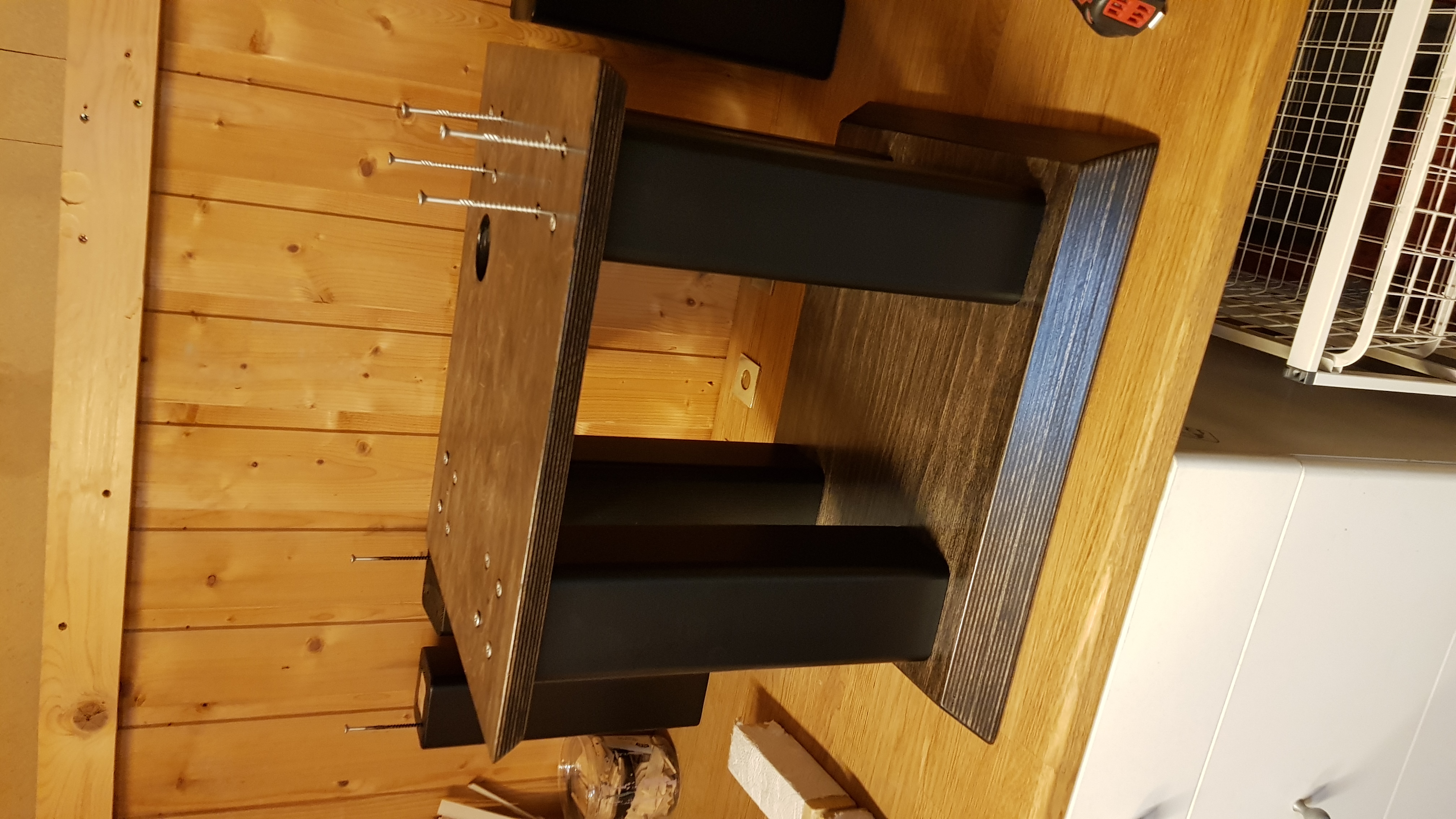 Promised some updates, and here it comes. Decided to finish the stands first. The bottom is made of two layers 21mm birch plywood, and the top is single plate. Top plate is tilted 3 degrees. I used two sheets plywood and it was just enough for speakers and stands.
