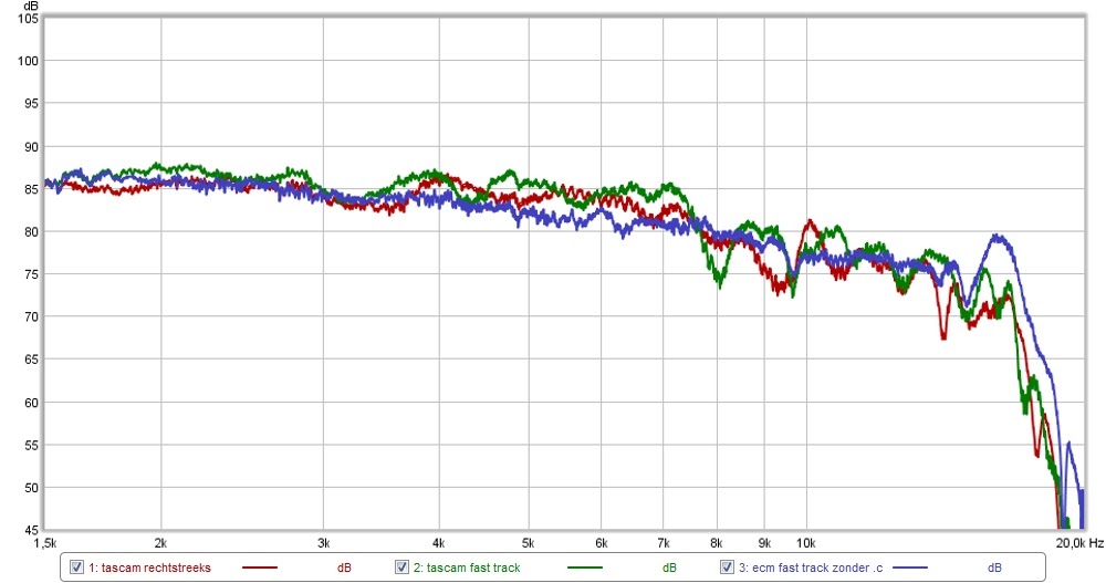 Blue line = EMC8000 mic connected to the USB audio card (M-audio Fast Track) WITHOUT .cal-file
