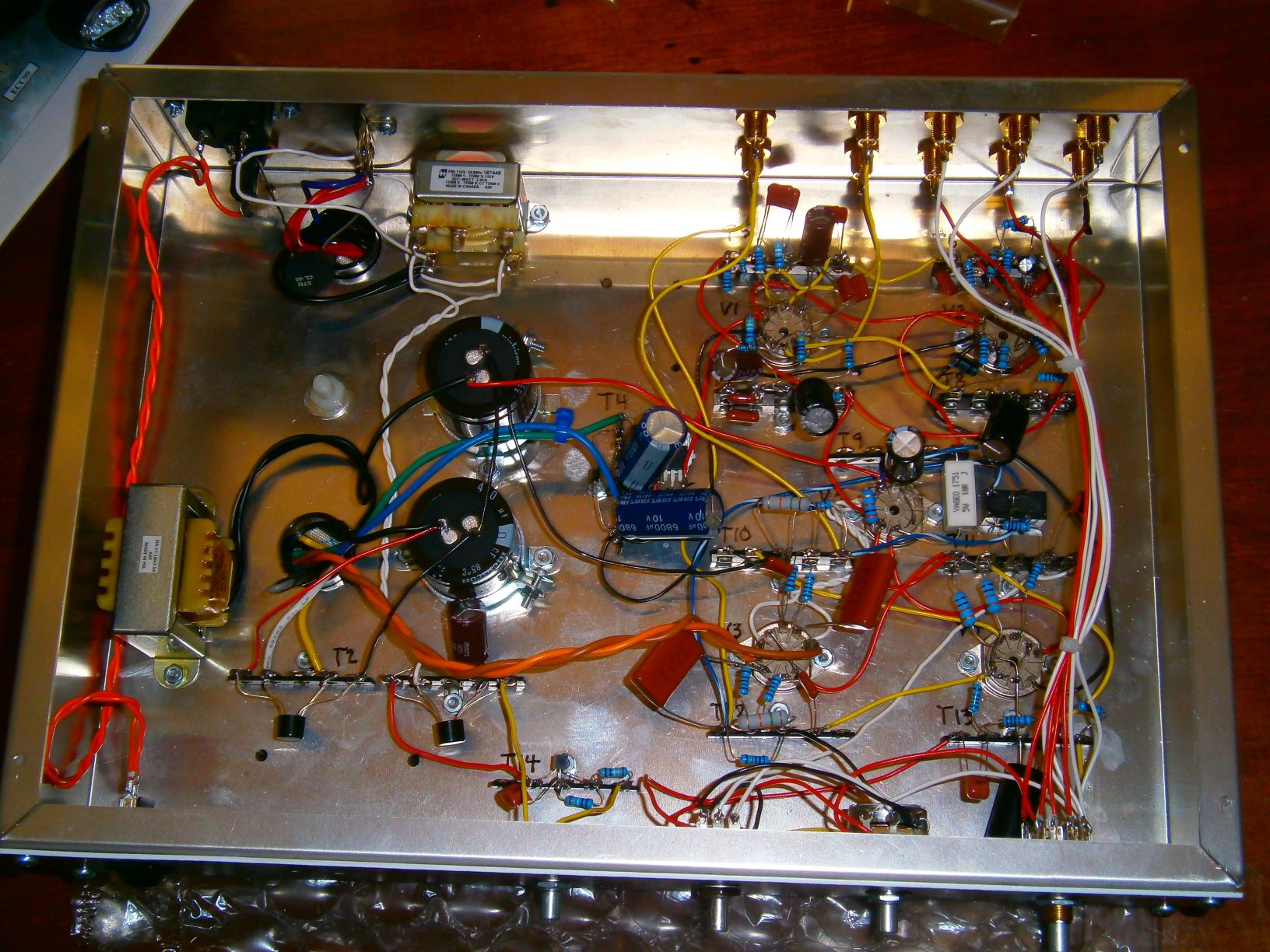 Whew! Done wiring...Finally. Did a cursory look over and called it a day. I'll go over everything this week. Soldering looks shiny enough, though sometimes I glommed a tad much. Soldering is a skill set that takes sheer volume of tries. I got much better towards the end. I'll go over everything and if all's well, button it up, put the knobs on an fire it up. Hoping against yet still, did I mess something up? That's what fuses are for. There are no fancy audiophile parts within, which a trained eye could tell. But, that's the philosophy of the designer. I'm alright with that.