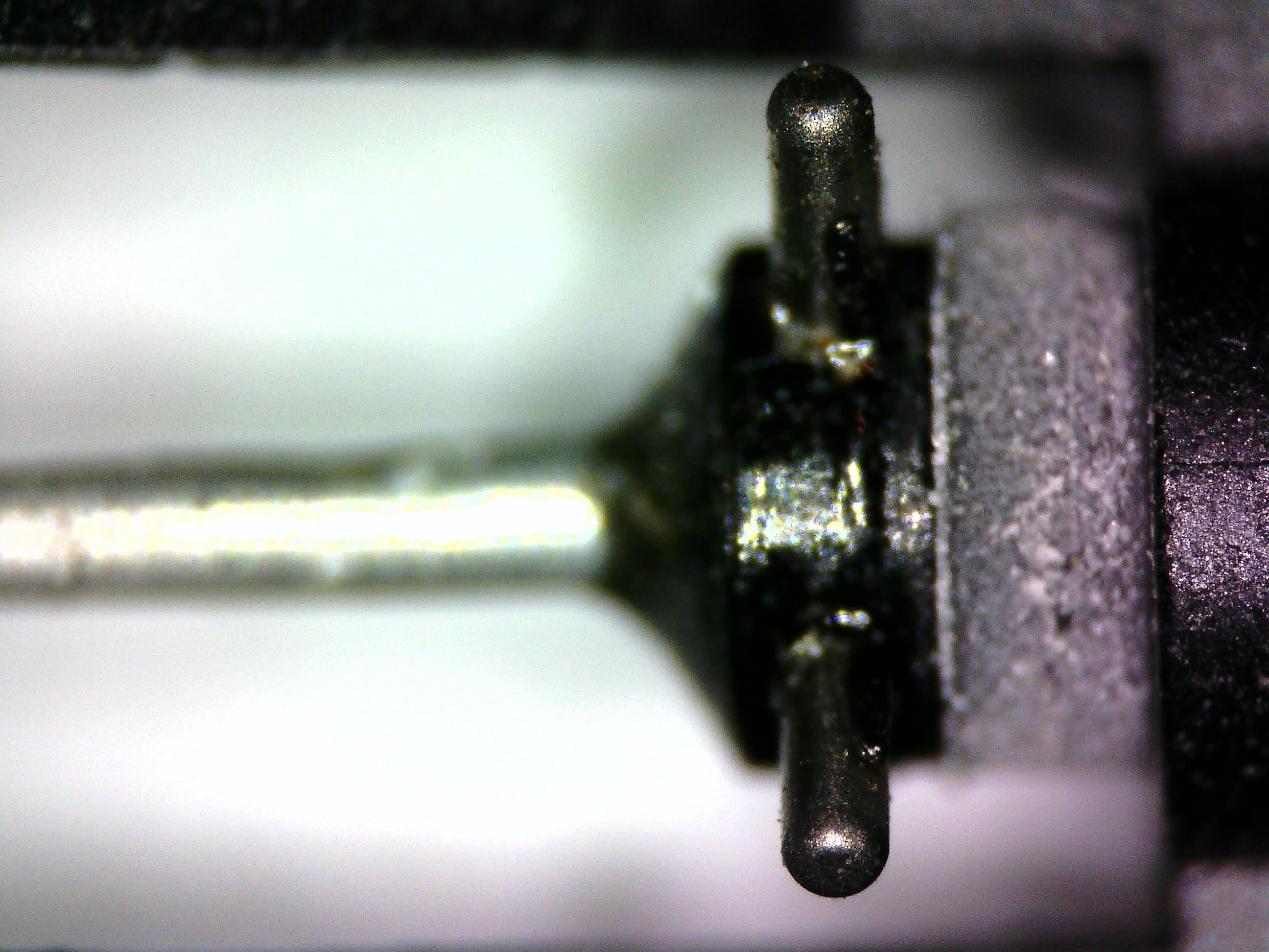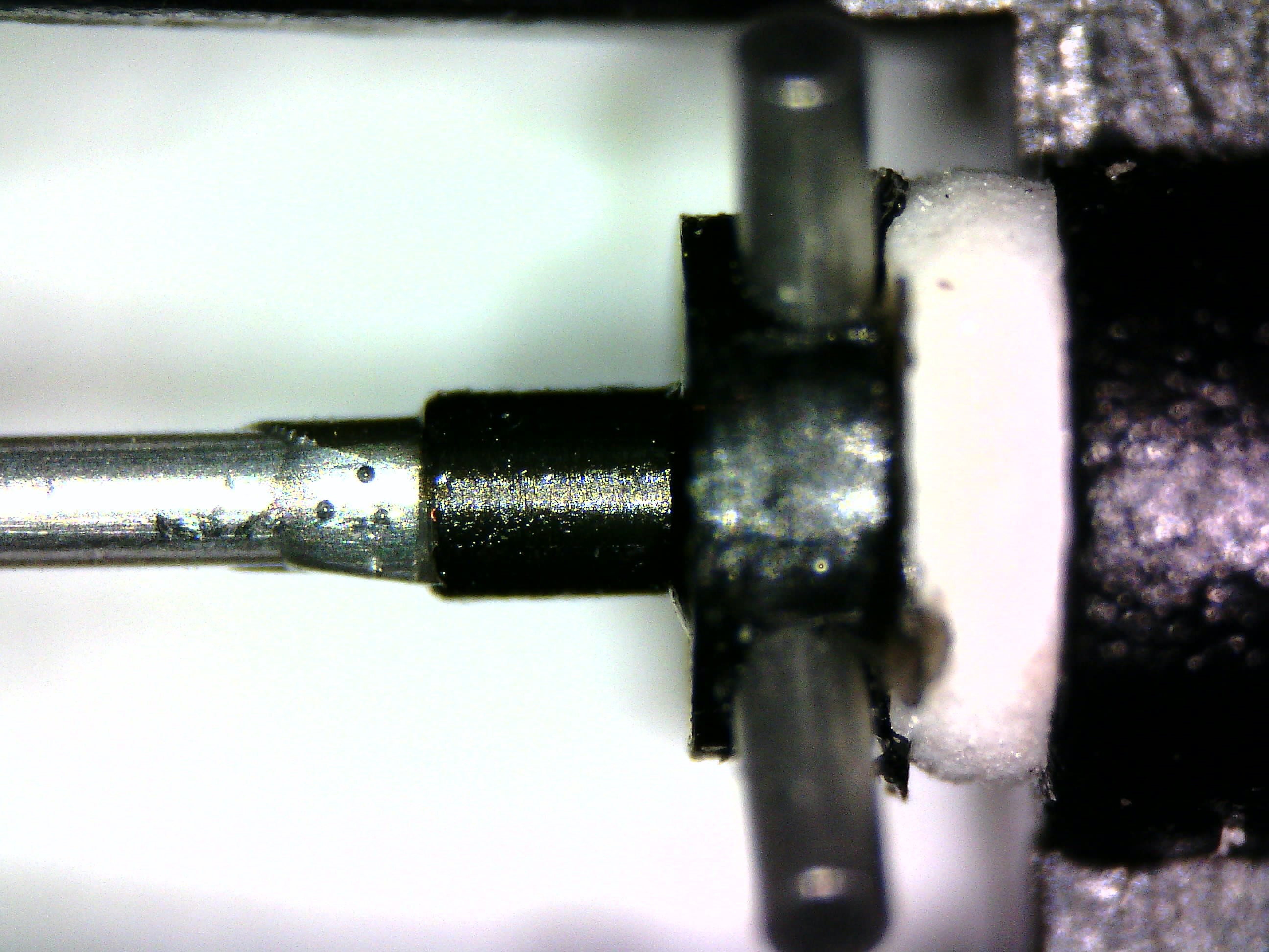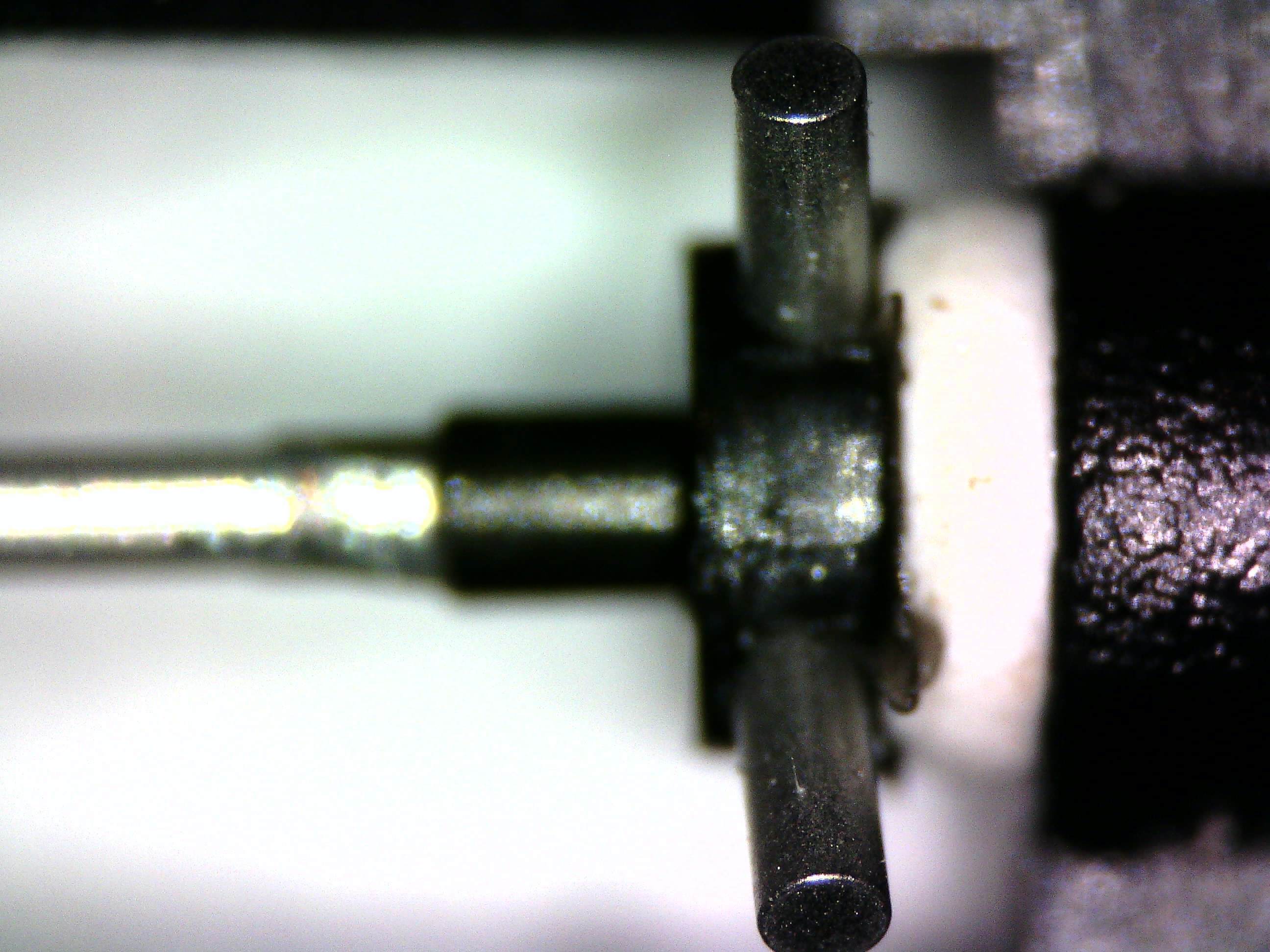 As I said, the focal point of the microscope is so tight that it could either focus on the cantilever shaft or the tip of the stylus, but not both. At higher magnification levels, it would even focus only on a section of the tip. So I rolled the focus knob up and down to focus first on the base, then the middle and finally the tip.