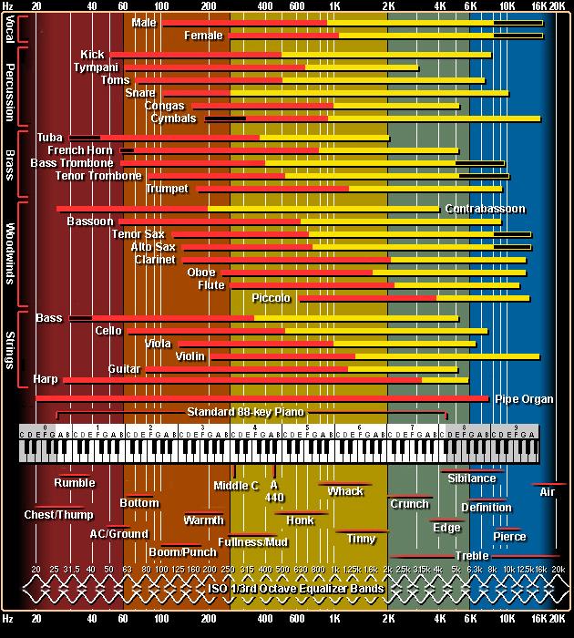That's the right thing to do for a traditional subwoofer, of course. You want the low-pass filter set no higher than 80Hz or 100Hz. That's true for distributed subs in a multisub arrangement too. Only the red areas in the chart below get sent to traditional subs and distributed subs. But flanking subs serve a little bit different purpose. They're run higher than normal, and so can be localized if they're too far away from the main speaker they're flanking.