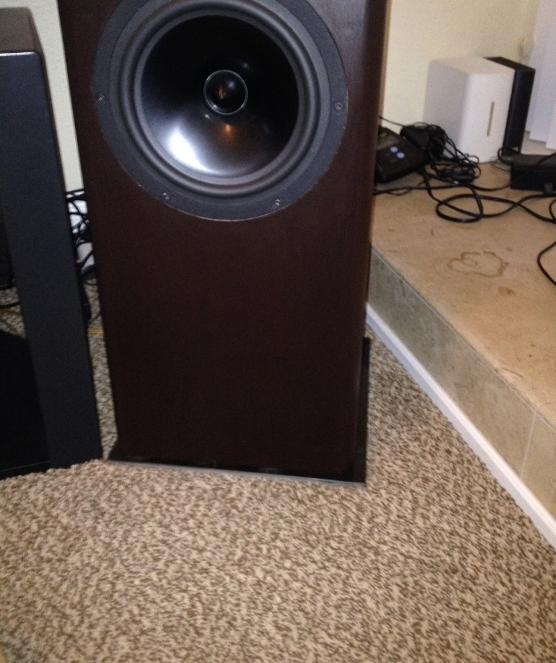 I've attached a pic of the problem area. The current speaker is 11" wide, the 4pi is 18.5" wide (and will have greater toe-in). I cannot move my entire setup over to the left to accommodate (stairway opening on the other side), so some portion of the 4pi has to sit on the raised floor.